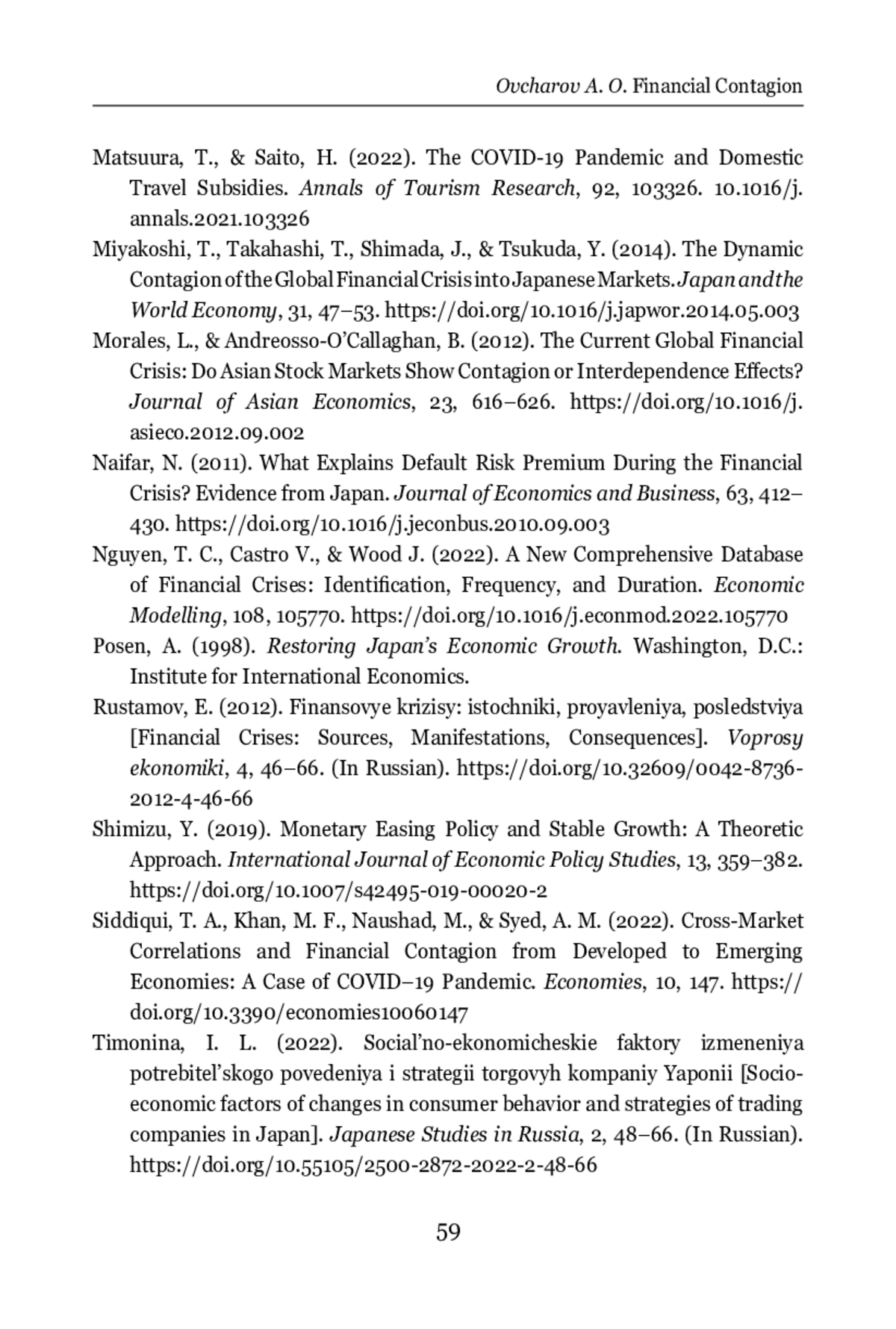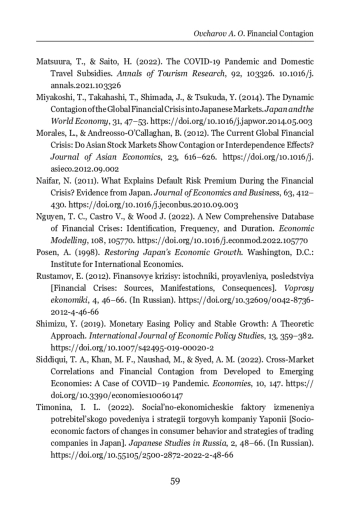 7. Dyomina Y. V., & Mazitova, M. G. (2021). Pandemiya COVID-19 i ee vliyanie na ekonomiku Yaponii. Japanese Studies in Russia, 3, 57-75. (In Russian). DOI: 10.24412/2500-2872-2021-3-57-75