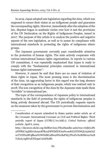 In 2019, Japan adopted new legislation regarding the Ainu, which was supposed to secure their status as an indigenous people and guarantee the corresponding rights. However, immediately after the adoption of the law, disputes began in academic circles over how it met the provisions of the UN Declaration on the Rights of Indigenous Peoples, issued in 2007. The purpose of this article is to analyze the positive and negative aspects of the new legislation, as well as to assess its compliance with international standards in protecting the rights of indigenous ethnic groups