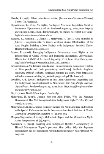 14. Maruyama, H. (2013). Japan’s Post-war Ainu Policy. Why the Japanese Government Has Not Recognized Ainu Indigenous Rights? Polar Record, 49 (2), 204-207.