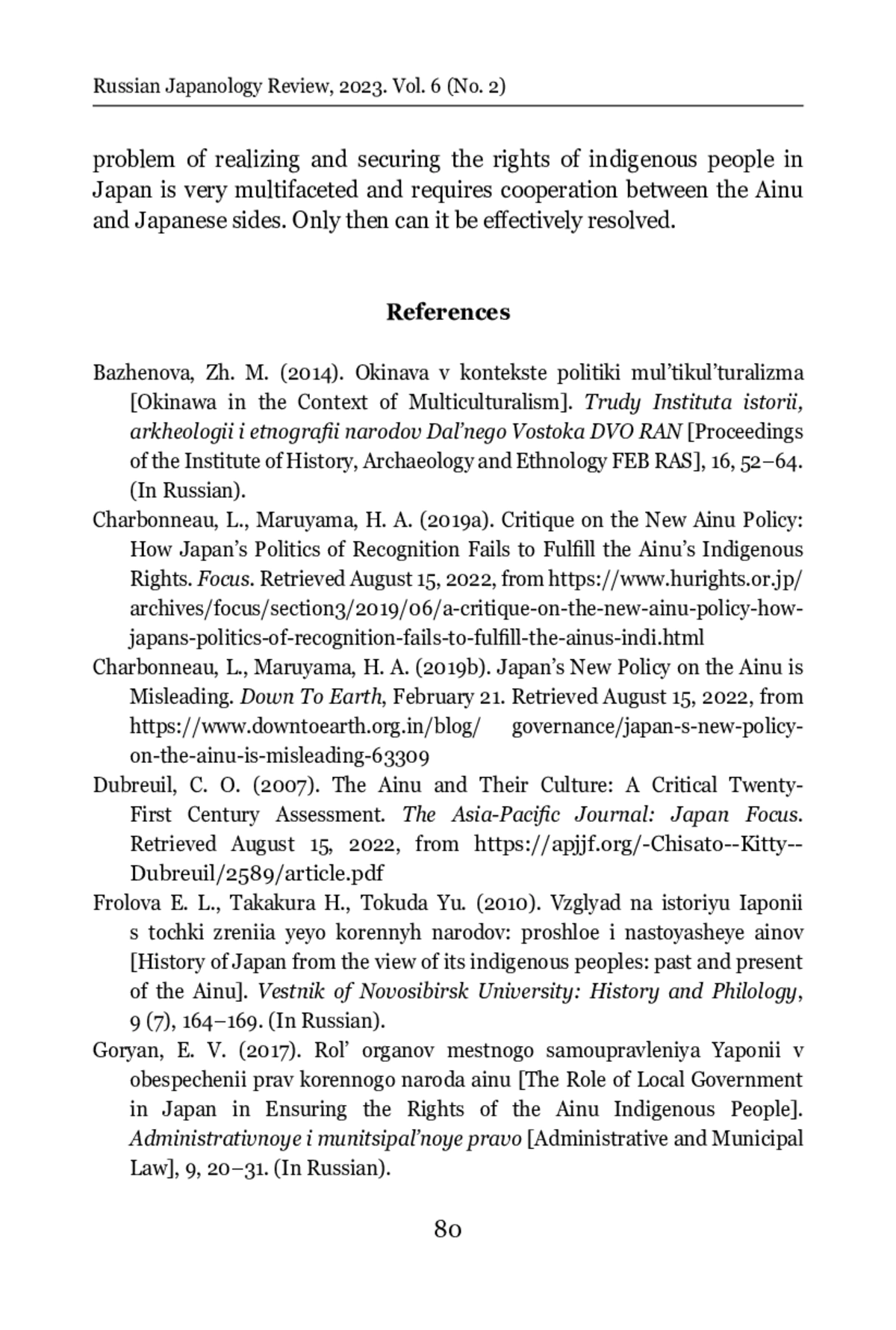 5. Frolova E. L., Takakura H., Tokuda Yu. (2010). Vzglyad na istoriyu Iaponii s tochki zreniia yeyo korennyh narodov: proshloe i nastoyasheye ainov. Vestnik of Novosibirsk University: History and Philology, 9 (7), 164-169. (In Russian).