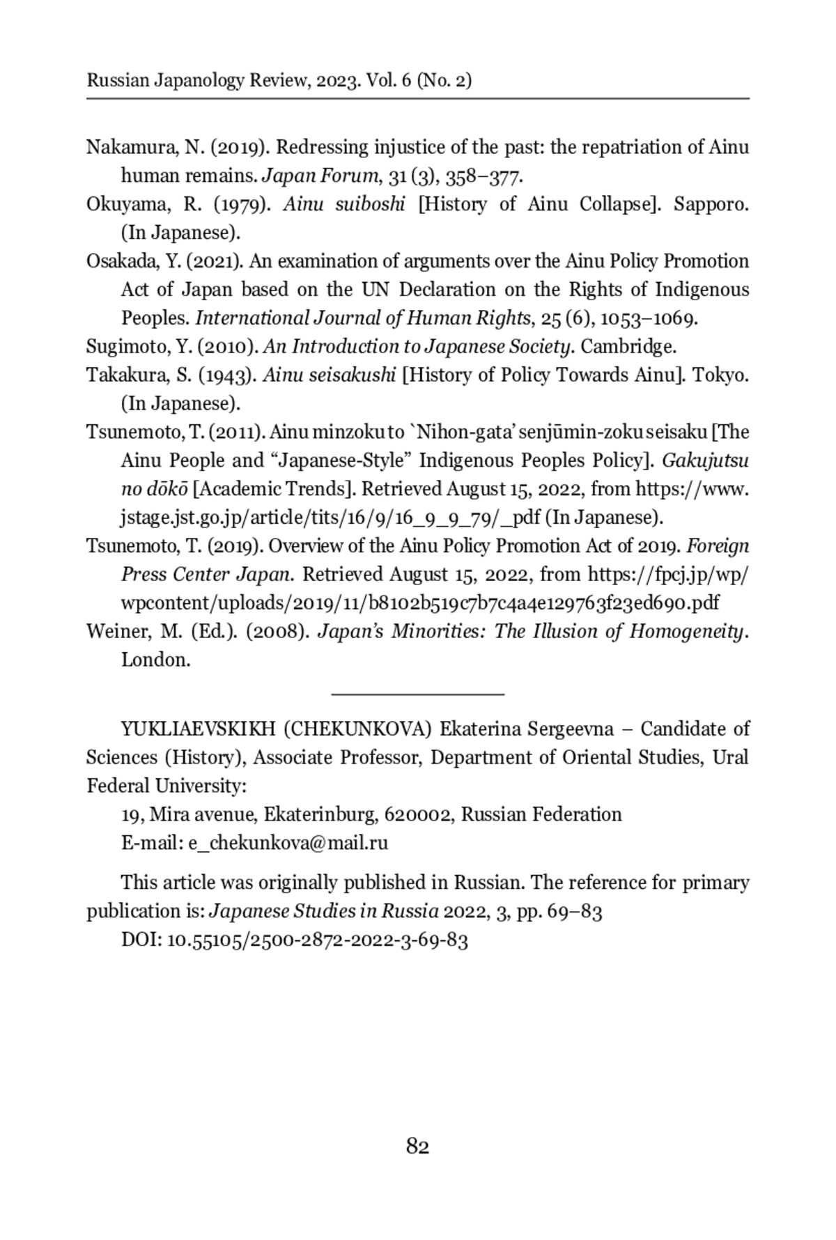 20. Osakada, Y. (2021). An examination of arguments over the Ainu Policy Promotion Act of Japan based on the UN Declaration on the Rights of Indigenous Peoples. International Journal of Human Rights, 25 (6), 1053-1069. EDN: BFVHVI
