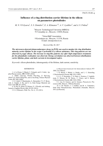 M. N. Vil’dyaeva, S. S. Demidov, E. A. Klimanov, A. V. Lyalikov, and A. S. Fokina Influence of a ring distribution carrier lifetime in the silicon on parameters photodiodes 282