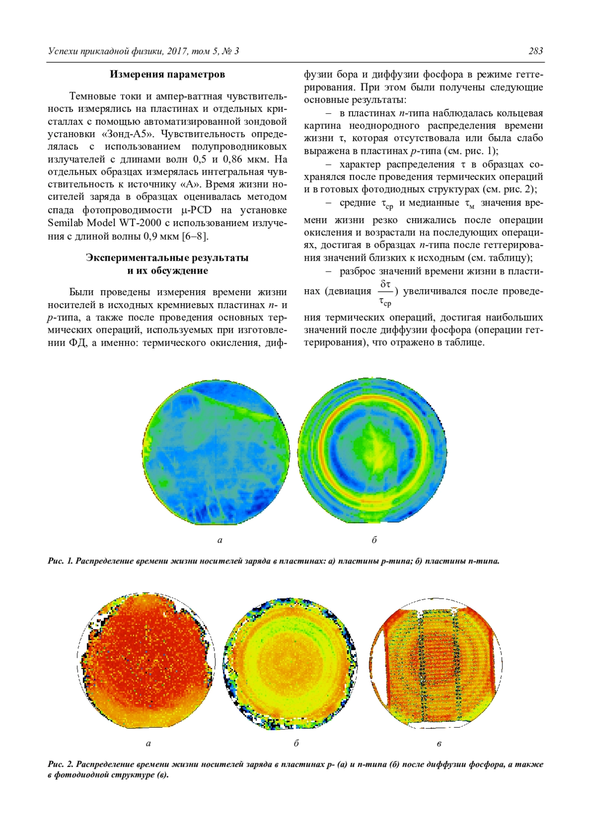 Обнаруженные кольцевые неоднородности в распределении времени жизни коррелируют с неоднородностями в распределении фото- и темнового тока фотодиодов, изготовленных на исследованных пластинах.
