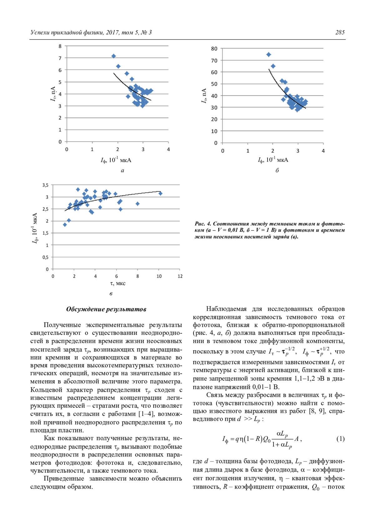 Возможной причиной неоднородностей являются страты роста, однако выяснение природы генерационно-рекомбинационых центров, определяющих значения р, Ip, Id, требует дальнейших исследований.