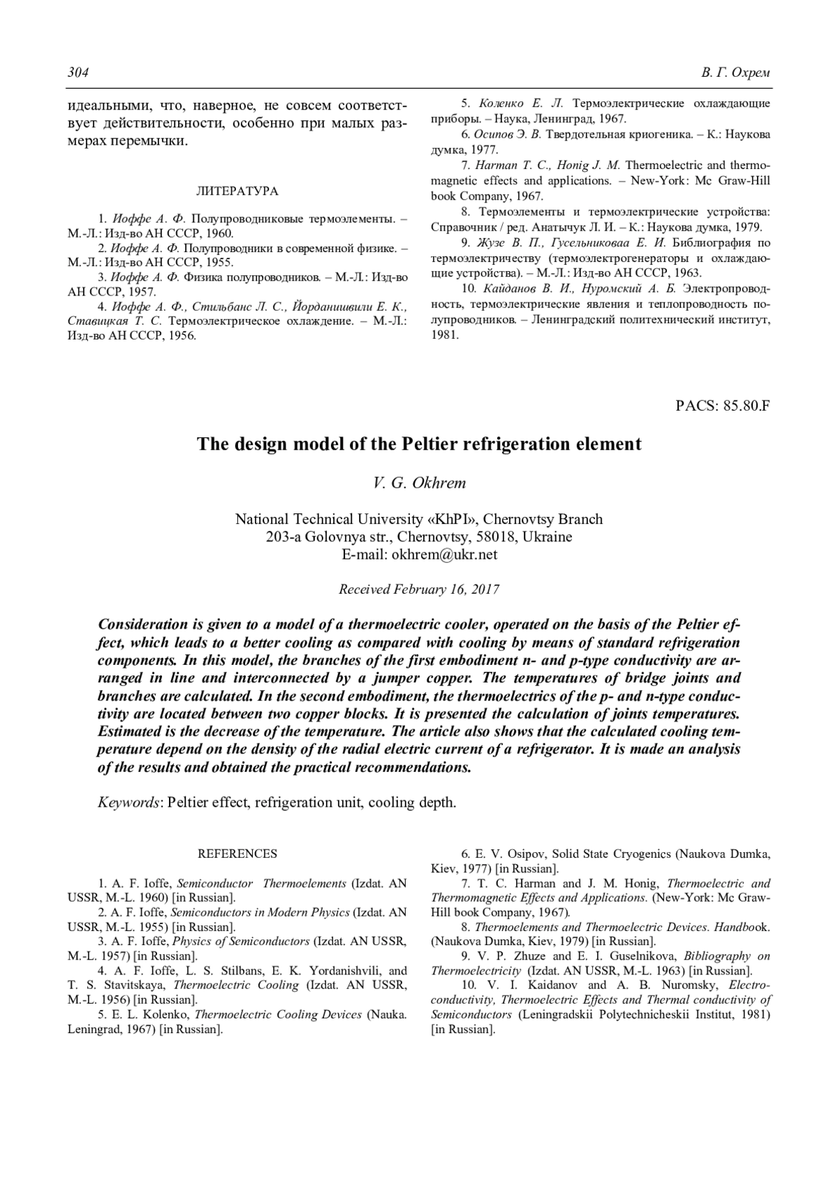 V. G. Okhrem The design model of the Peltier refrigeration element 299