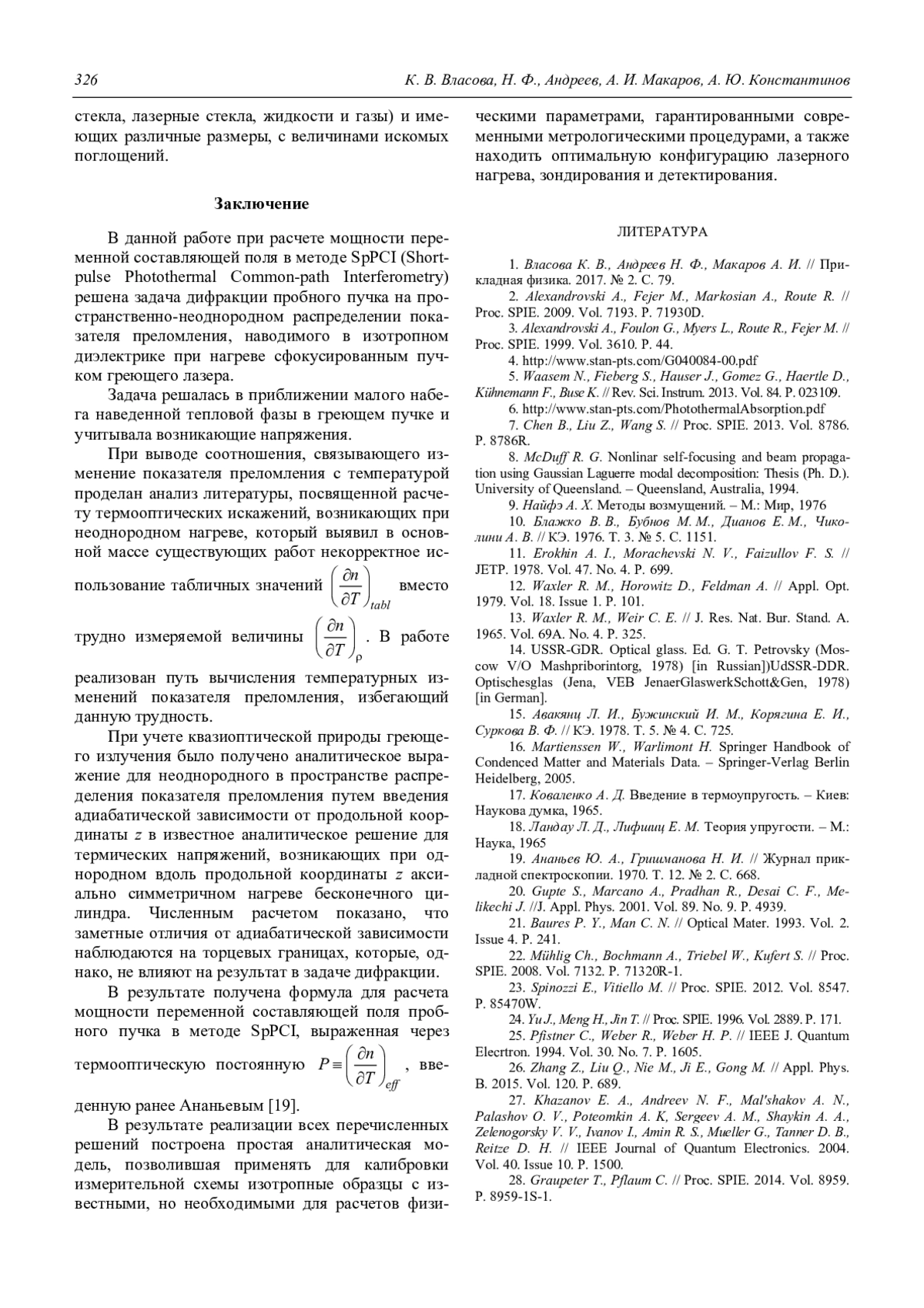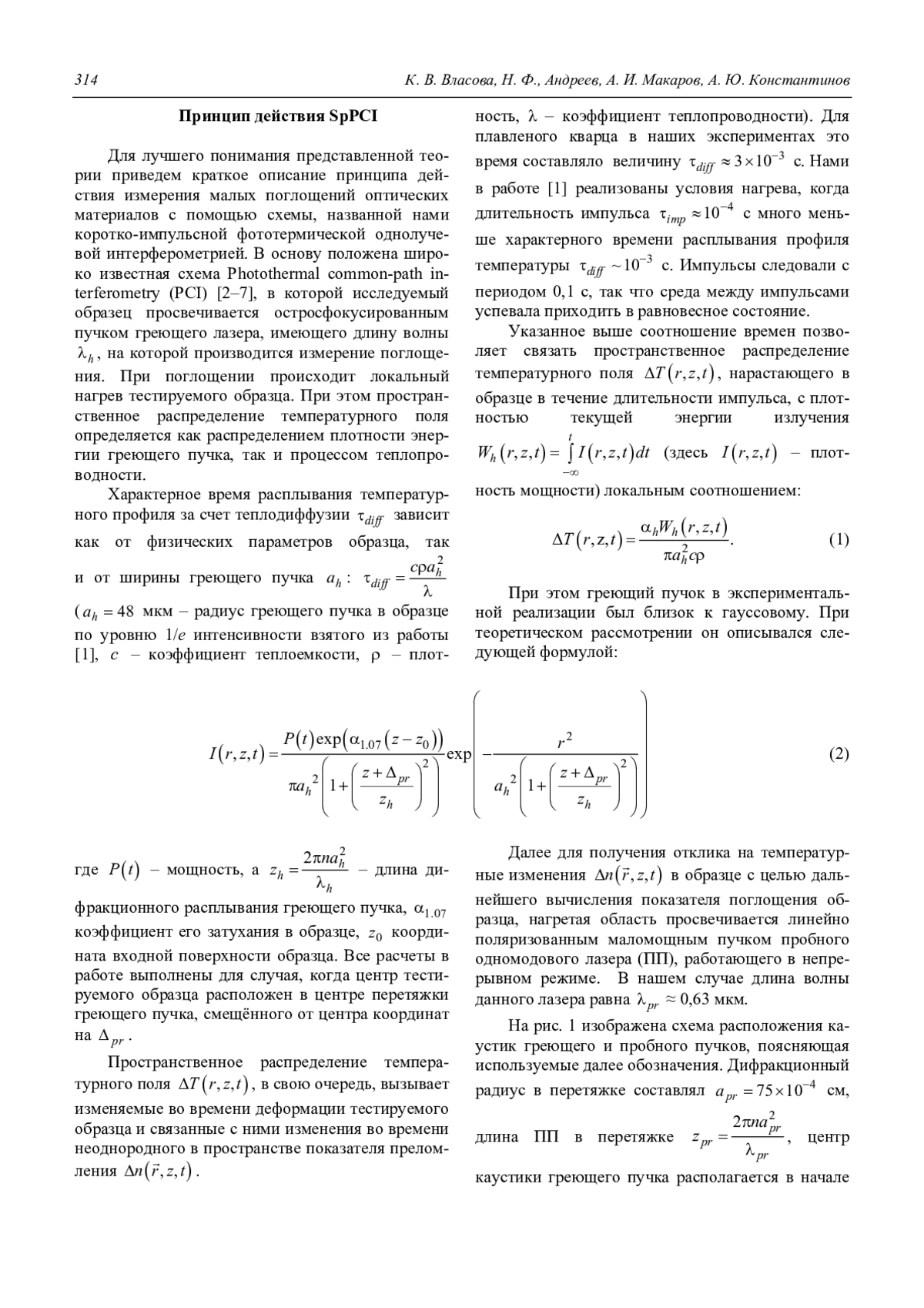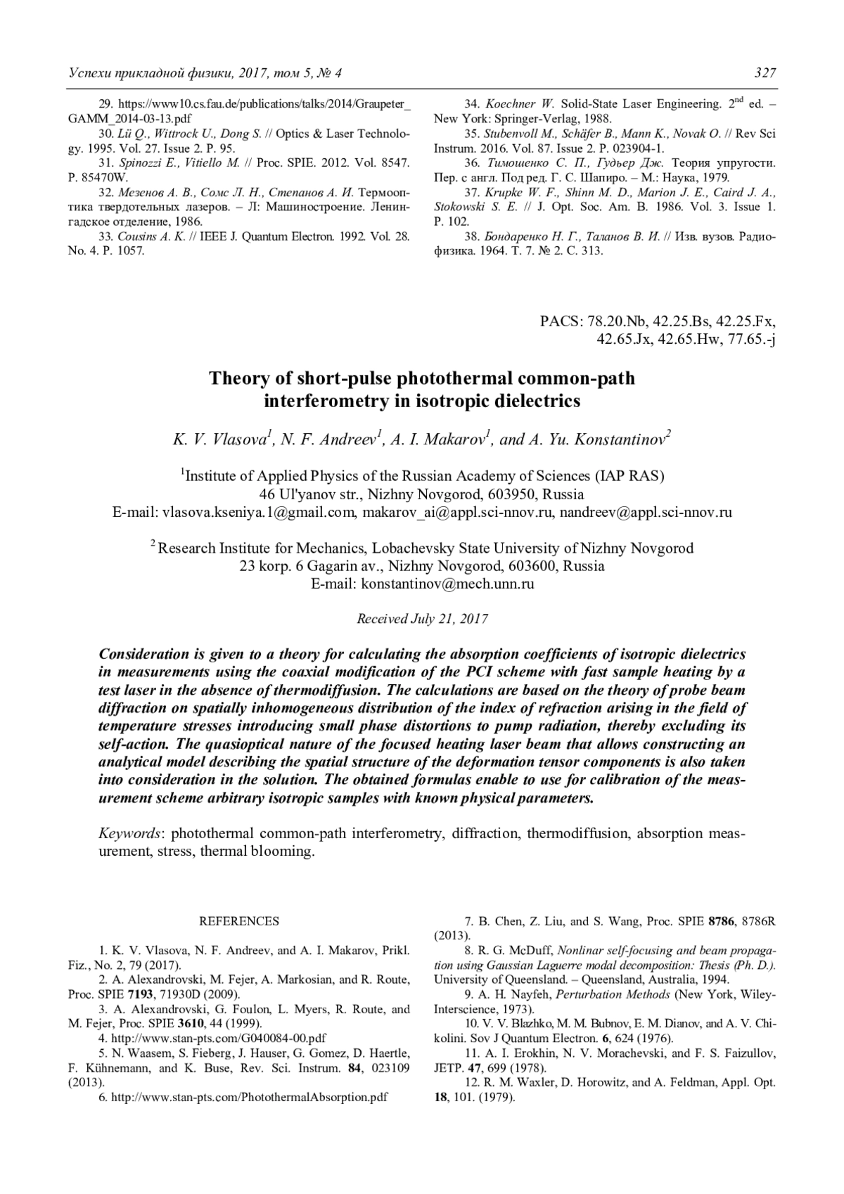 Представлена теория для вычисления коэффициентов поглощения в изотропных диэлектриках при измерениях с помощью соосной модификации схемы PCI с быстрым нагревом образцов тестирующим лазером при отсутствии термодиффузии. Расчеты основаны на теории дифракции пробного пучка на пространственно-неоднородном распределении показателя преломления, возникающего в поле температурных напряжений, вносящих малые фазовые искажения в греющее излучение, что исключает его самовоздействие. При решении учтена квазиоптическая природа сфокусированного греющего лазерного пучка, позволившая построить аналитическую модель, описывающую пространственную структуру компонентов тензора деформации. Полученные формулы позволяют применять для калибровки измерительной схемы образцы стекол с известными, необходимыми для расчетов, физическими параметрами, гарантированными метрологическими процедурами.