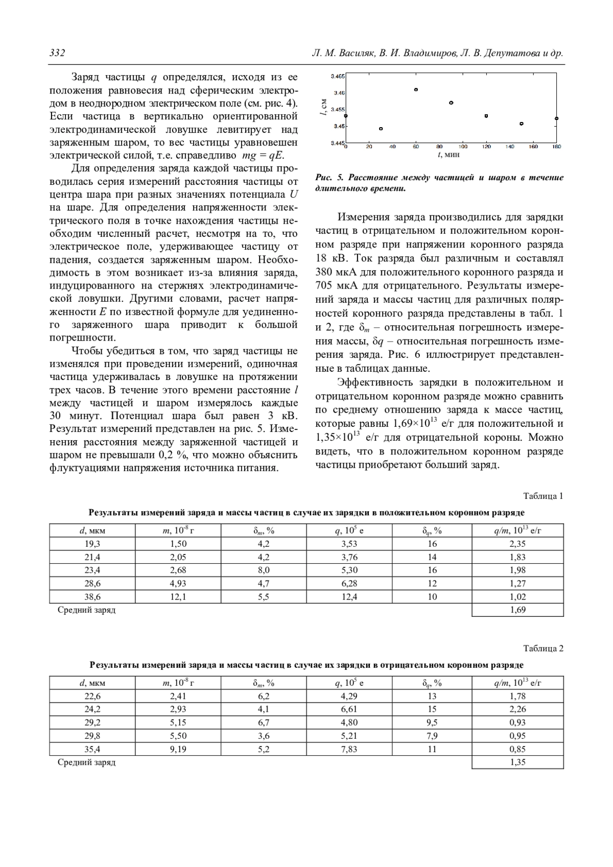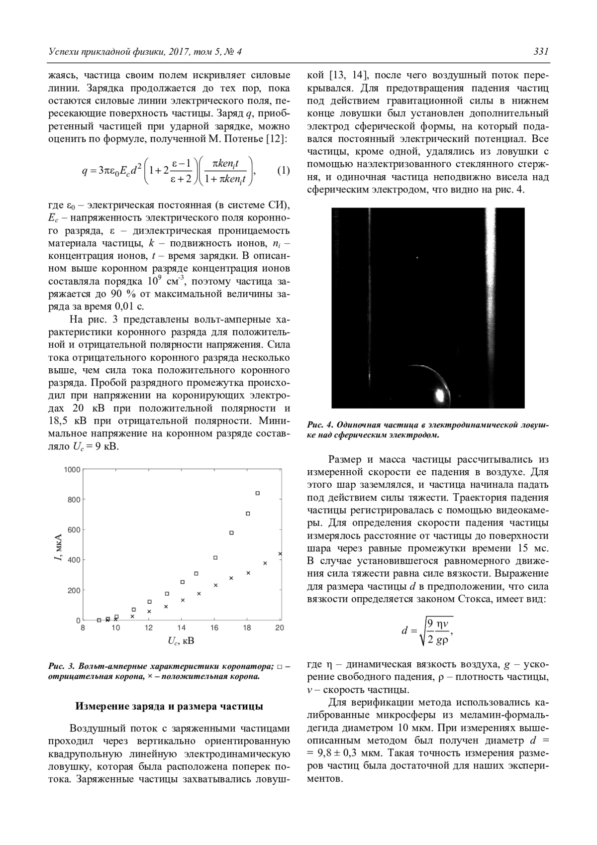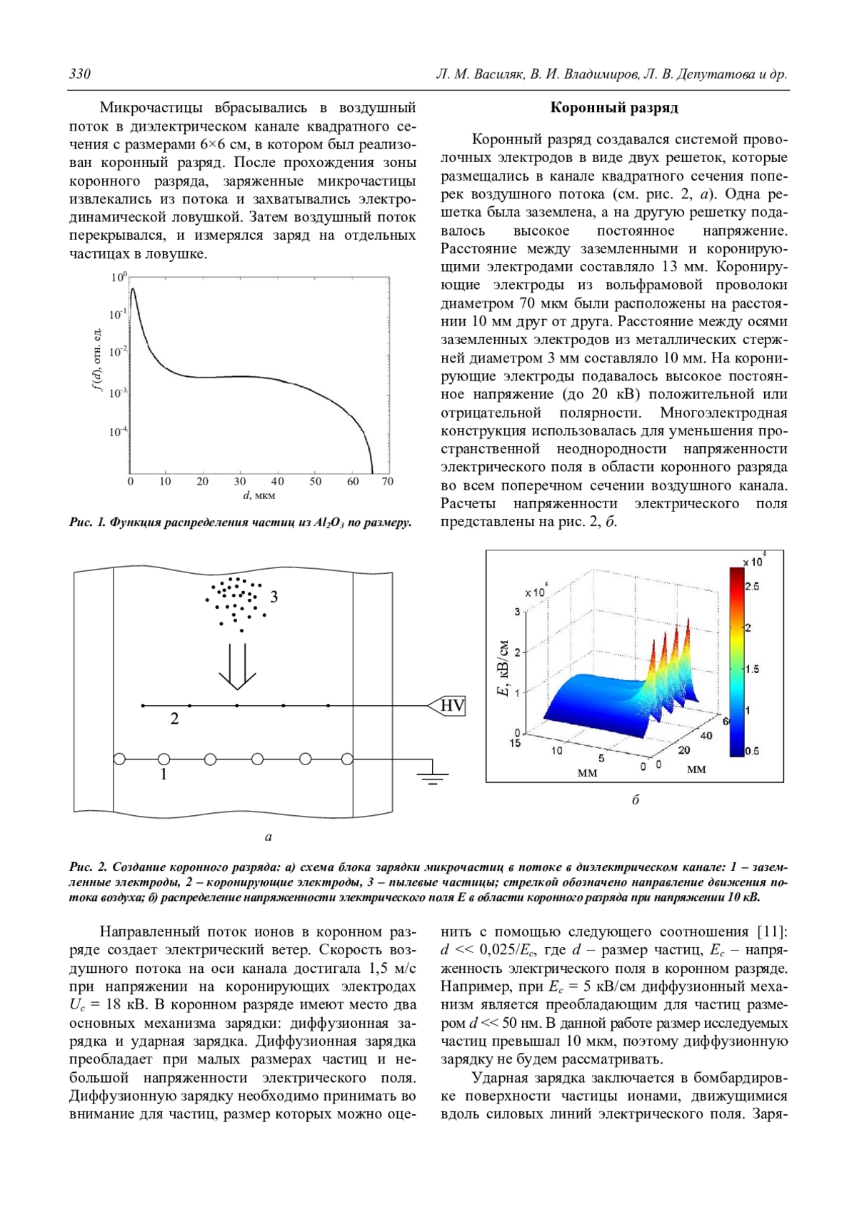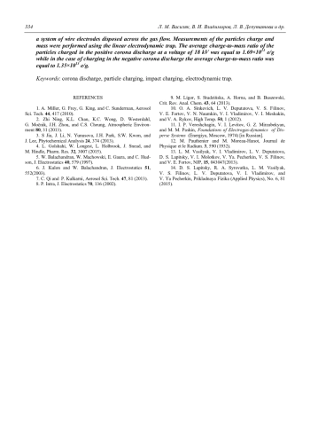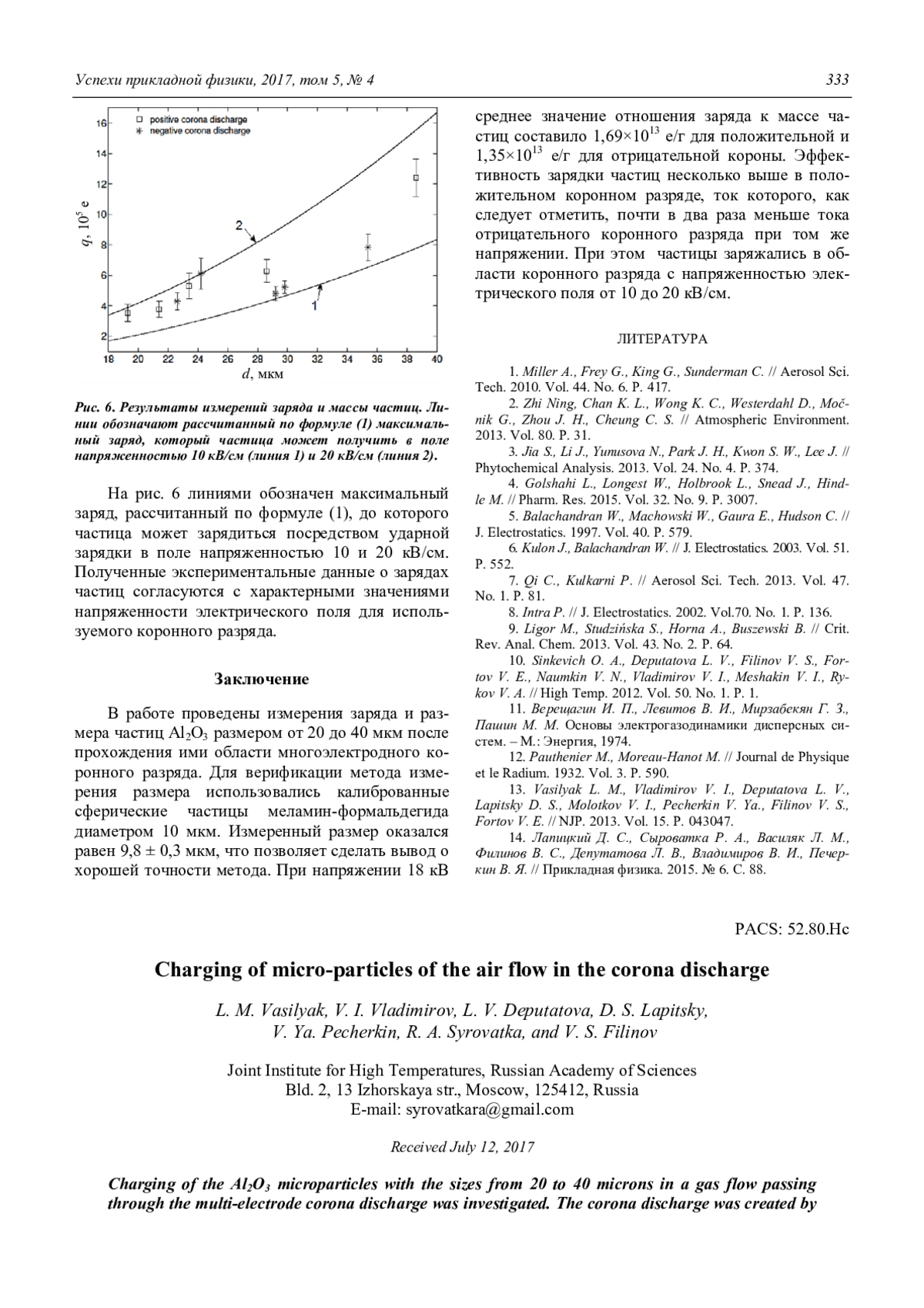 Исследована зарядка частиц Al2O3 размером от 20 до 40 мкм в воздушном потоке, проходящем через область многоэлектродного коронного разряда. Коронный разряд создавался системой проволочных электродов, расположенных поперек потока. Измерение заряда и массы частиц производилось с помощью линейной электродинамической ловушки. Среднее отношения заряда к массе частиц, прошедших через коронный разряд при напряжении 18 кВ, составило 1,69×1013 e/г для положительной полярности и 1,35×1013 e/г для отрицательной.