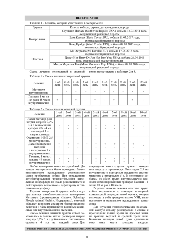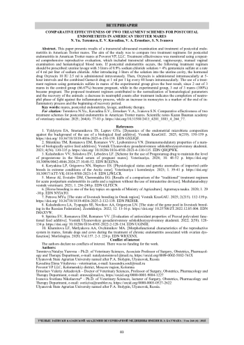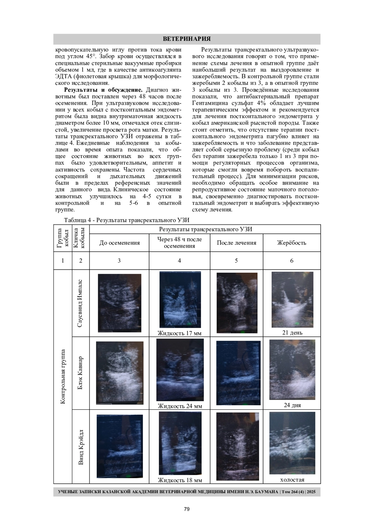 В работе представлены результаты трансректального ультразвукового исследования и лечения посткоитального эндометрита у кобыл американской рысистой породы. Целью исследования являлось изучение в сравнительном аспекте двух схем лечения посткоитального эндометрита у кобыл американской рысистой породы в условиях ООО «Поворот ВП». Результативность лечения отслеживалась с помощью повторной комплексной репродуктивной оценки, которая включала в себя трансректальное УЗИ, вагиноскопию, мануальное исследование влагалища и исследование гематологических показателей крови. При возникновении посткоитального эндометрита необходимо назначать следующую схему лечения: Лаваж матки раствором натрия хлорида 0,9% 3 л + гентамицина сульфат 4% 4 мл на каждый литр натрия хлорида. После введения в полость матки 3 л раствора вводится гормональный препарат Окситоцин 10МЕ 2,5 мл внутривенно. Далее повторение введения Окситоцина с интервалом 5 ч внутримышечно, комбинированный препарат Гамавит 1 мл на 1 кг раз в 48 часов внутримышечно. Применение схемы лечения с использованием гентамицина сульфата у кобыл опытной группы даёт наилучший результат, поскольку в контрольной группе стали жеребыми 2 кобылы из 3 (66,67%), а в опытной группе 3 кобылы из 3 (100%). Применение предложенной схемы лечения способствовало нормализации гематологических показателей и выздоровлению животных: уменьшение содержания нейтрофилов после лечения говорит о завершении нейтрофильной фазы борьбы с воспалительным процессом, повышение моноцитов является маркером завершения воспалительного процесса и начала периода восстановления организма.