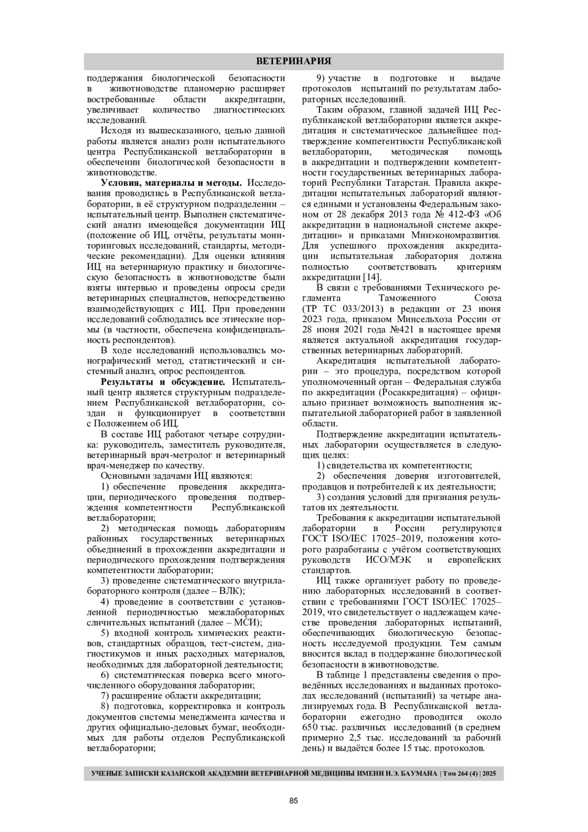 Исследование посвящено анализу деятельности испытательного центра (ИЦ) государственного бюджетного учреждения «Республиканская ветеринарная лаборатория» Республики Татарстан и его роли в обеспечении биологической безопасности животноводства. Свою деятельность ИЦ осуществляет на основе Положения об ИЦ, в соответствии с требованиями регионального и федерального законодательства, а также международных стандартов. На основе систематического изучения документации, результатов опросов ветеринарных специалистов и статистического анализа установлено, что ИЦ выполняет ключевые функции: аккредитацию лаборатории, методическую поддержку районных ветеринарных лабораторий, контроль качества исследований, расширение областей аккредитации. В структуре ИЦ работают четыре специалиста: руководитель, заместитель руководителя, ветеринарный врач – метролог и ветеринарный врач – менеджер по качеству. Основные направления деятельности ИЦ включают организацию внутрилабораторного контроля, проведение межлабораторных сличительных испытаний, входной контроль реактивов и оборудования, а также подготовку протоколов испытаний. Статистические данные за 2021-2024 годы показывают значительный рост бактериологических (до 147,6%), токсикологических (до 265,8%) и паразитологических (до 406,1%) исследований. Особое внимание уделяется исследованиям особо опасных заболеваний животных – бешенство, бруцеллез, туберкулез, сибирская язва, африканская чума свиней. Установлено, что ИЦ постоянно взаимодействует с заказчиками исследований – крупными агрохолдингами республики и личными подсобными хозяйствами граждан. Такое взаимодействие способствует повышению достоверности проведённых лабораторных исследований. Результаты подтверждают, что деятельность ИЦ на прямую влияет на биологическою безопасность в животноводстве, предотвращая распространение особо опасных болезней животных и тем самым снижая экономические потери в республике. Данное исследование имеет практическую ценность для совершенствования организации работы ветеринарных лабораторий и разработки мер по повышению качества ветеринарного обслуживания.