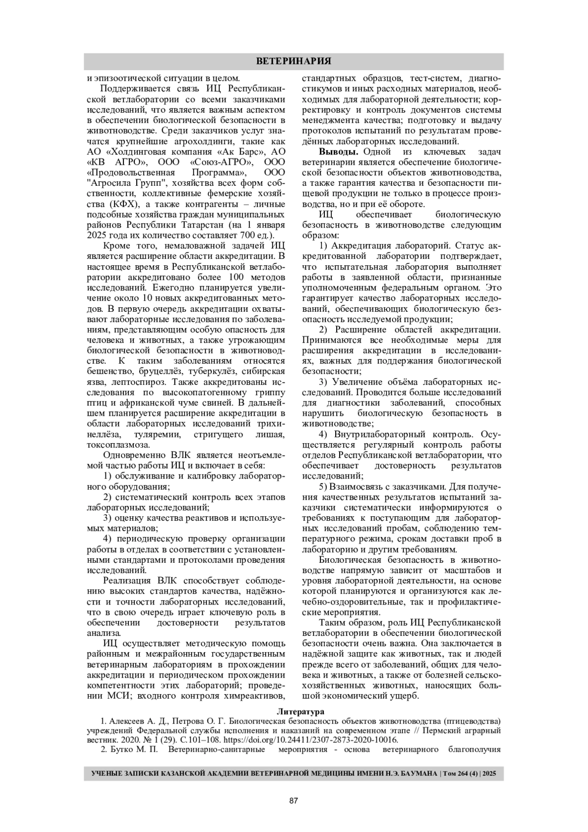 4. Русинович А. А., Жалдыбин В. В. Ветеринарная деятельность в обеспечении биологической безопасности // Эпизоотология, иммунобиология, фармакология и санитария. 2023. № 1. С. 3-7.