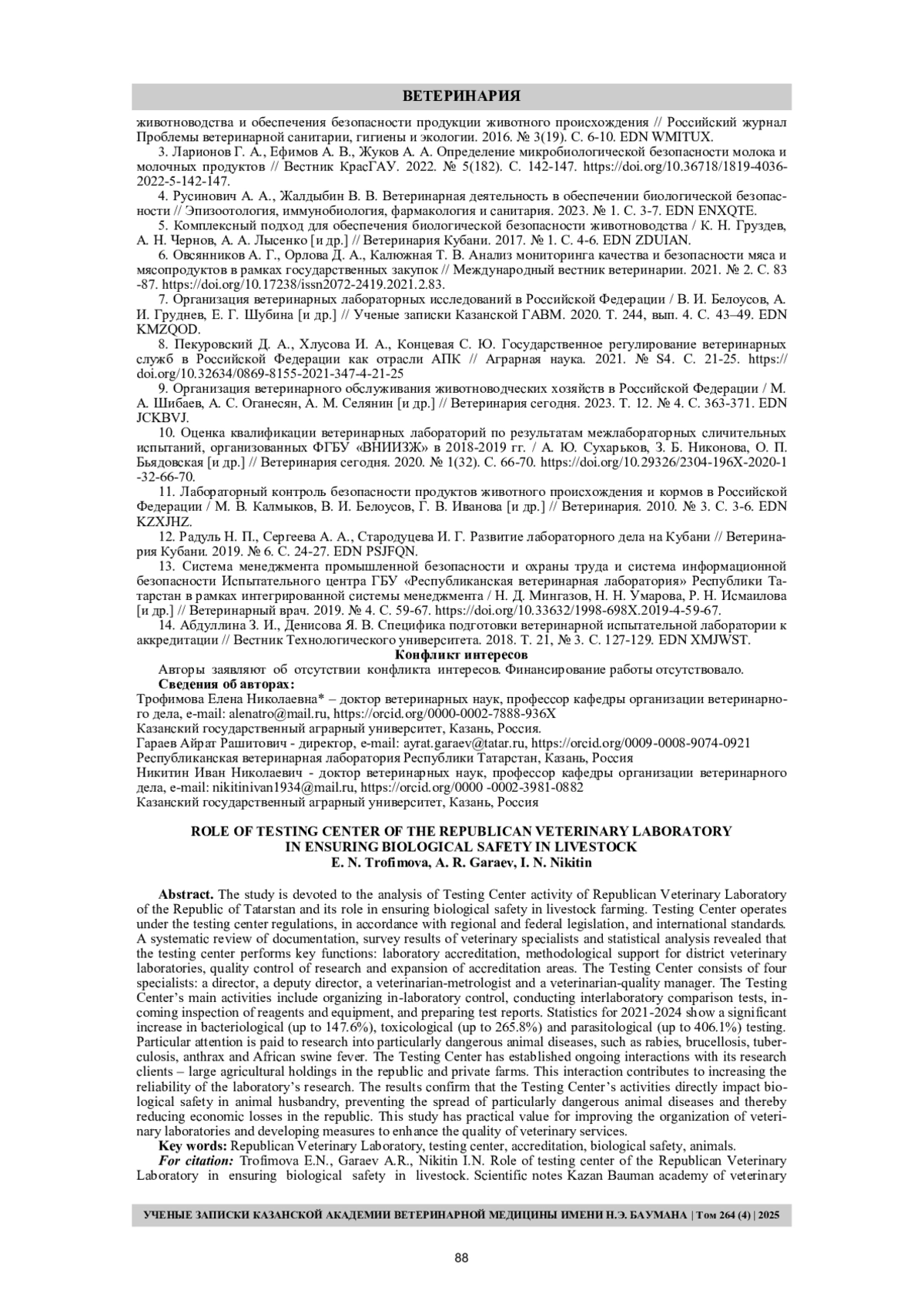 7. Организация ветеринарных лабораторных исследований в Российской Федерации / В.И. Белоусов, А.И. Груднев, Е.Г. Шубина и др. // Ученые записки Казанской ГАВМ. 2020. Т. 244, вып. 4. С. 43-49.