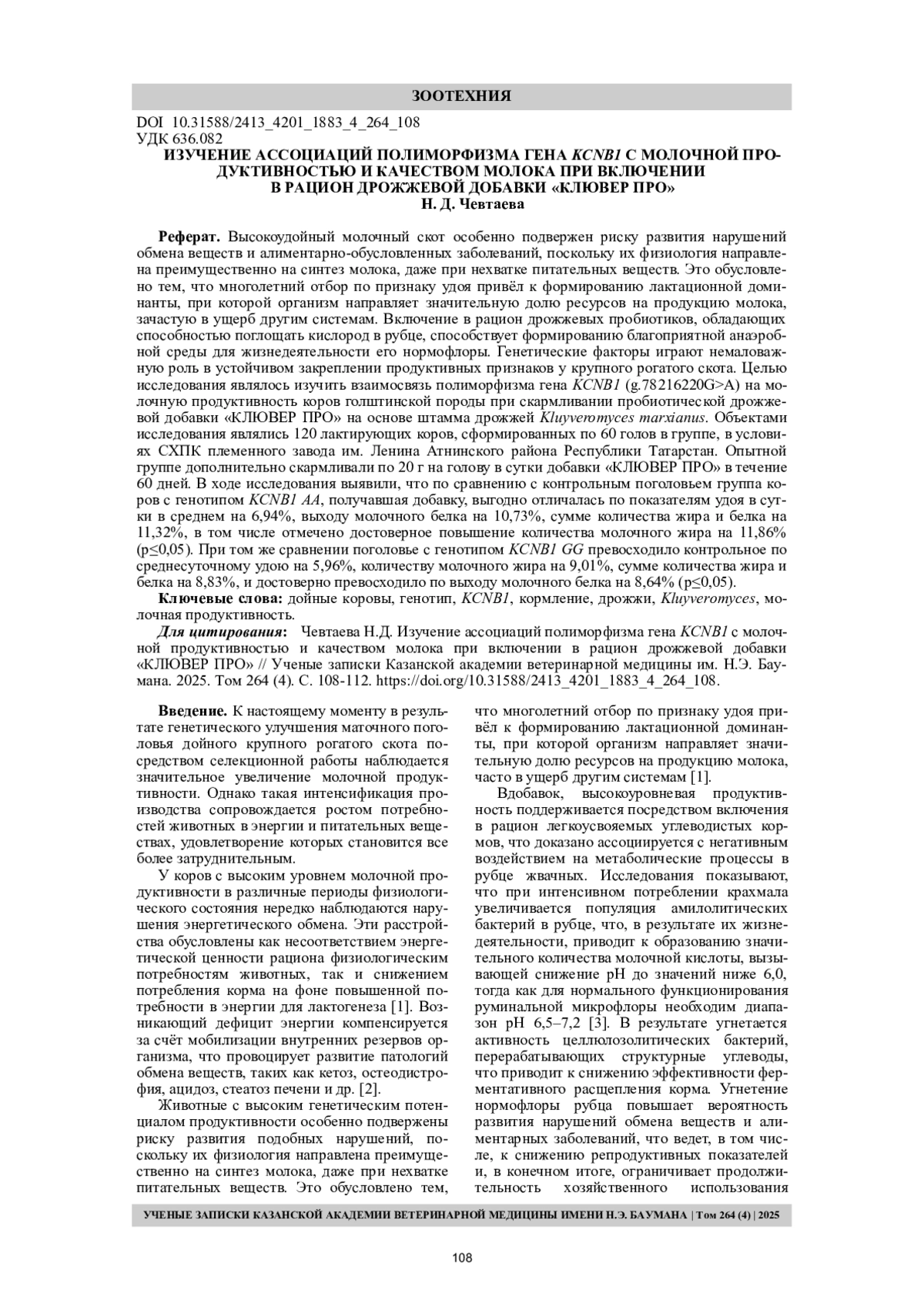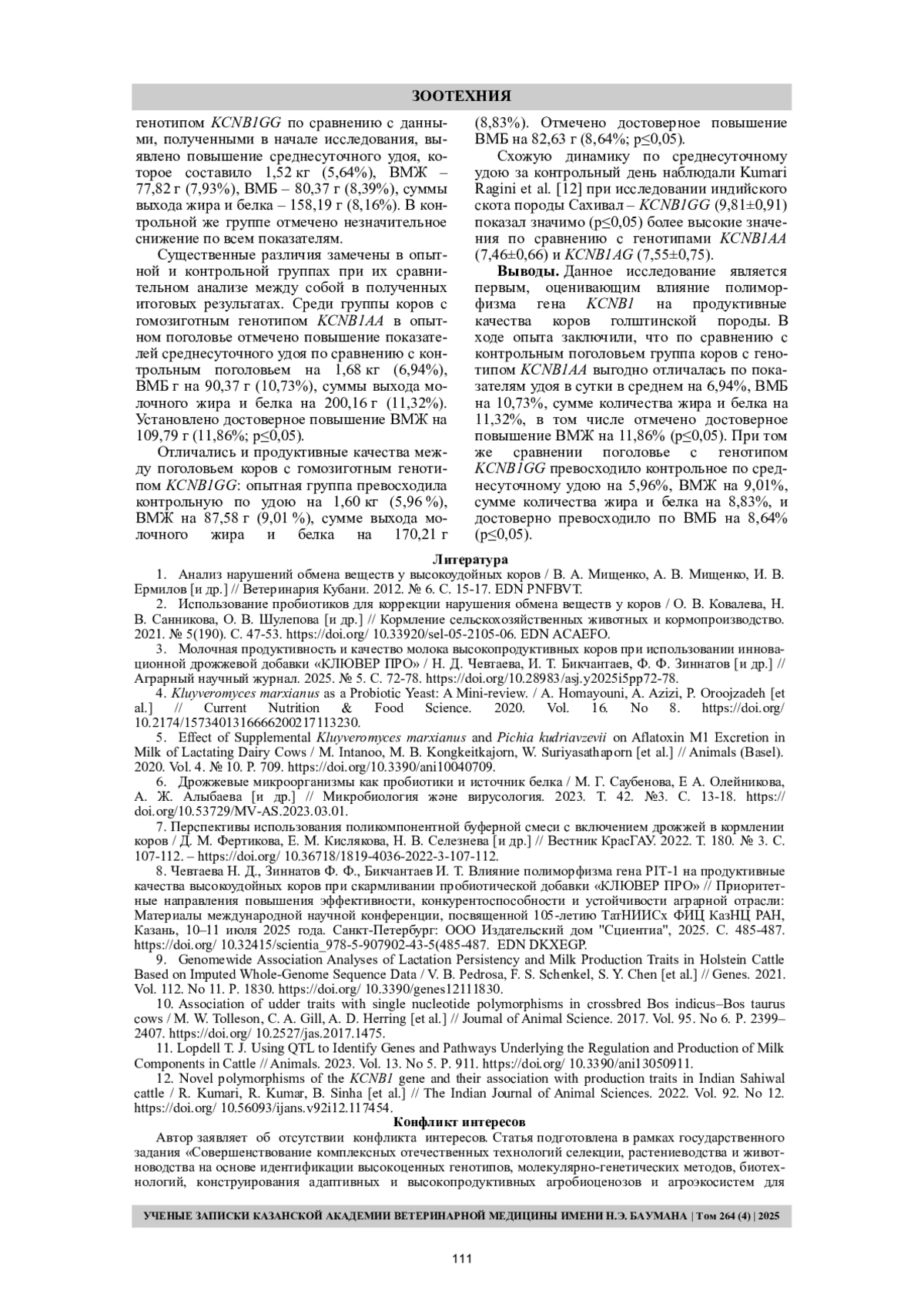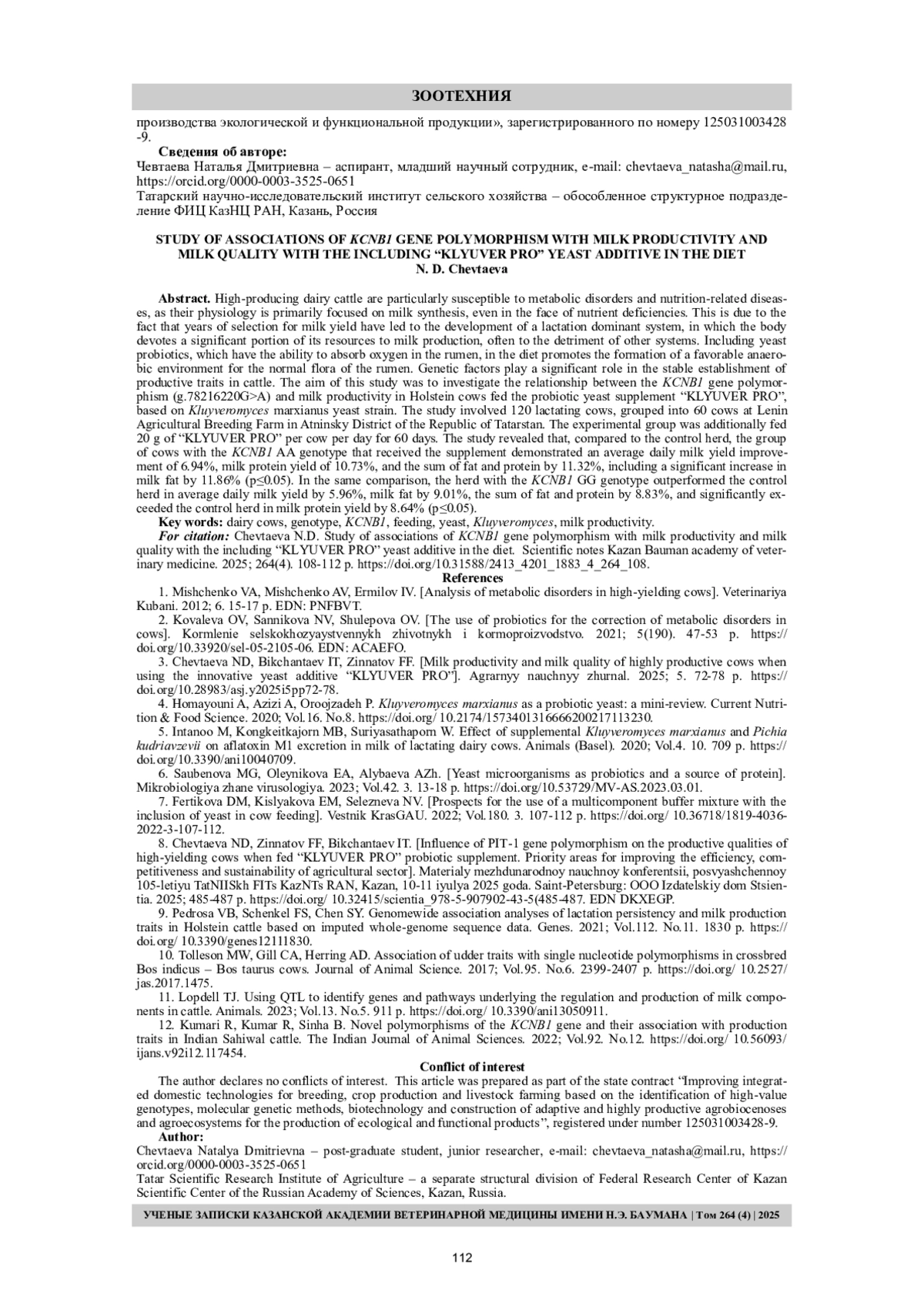 8. Чевтаева Н. Д., Зиннатов Ф. Ф., Бикчантаев И. Т. Влияние полиморфизма гена PIT-1 на продуктивные качества высокоудойных коров при скармливании пробиотической добавки «КЛЮВЕР ПРО» // Приоритетные направления повышения эффективности, конкурентоспособности и устойчивости аграрной отрасли: Материалы международной научной конференции, посвященной 105-летию ТатНИИСх ФИЦ КазНЦ РАН, Казань, 10-11 июля 2025 года. Санкт-Петербург: ООО Издательский дом “Сциентиа”, 2025. С. 485-487. EDN DKXEGP. DOI: 10.32415/scientia_978-5-907902-43-5(485-487