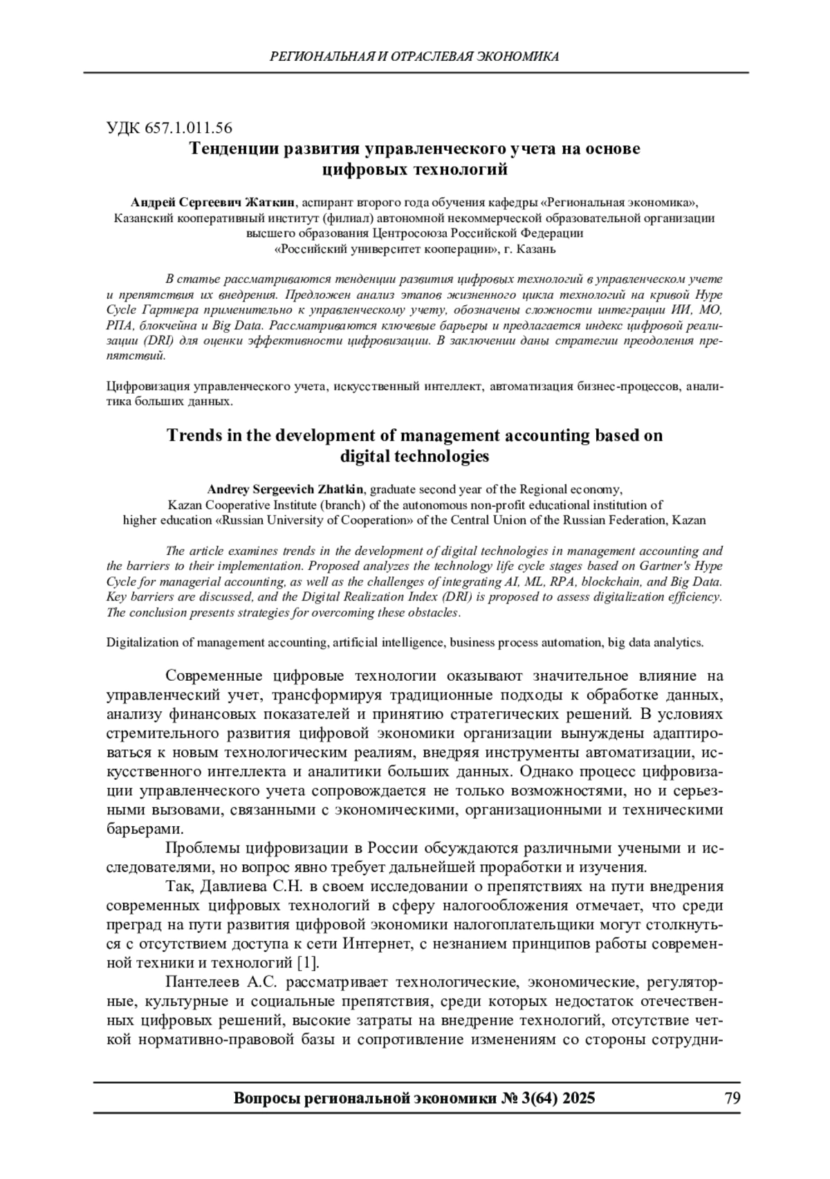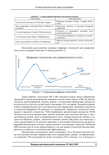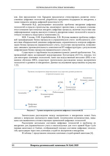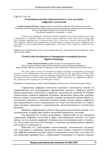 В статье рассматриваются тенденции развития цифровых технологий в управленческом учете и препятствия их внедрения. Предложен анализ этапов жизненного цикла технологий на кривой Hype Cycle Гартнера применительно к управленческому учету, обозначены сложности интеграции ИИ, МО, РПА, блокчейна и Big Data. Рассматриваются ключевые барьеры и предлагается индекс цифровой реализации (DRI) для оценки эффективности цифровизации. В заключении даны стратегии преодоления препятствий.