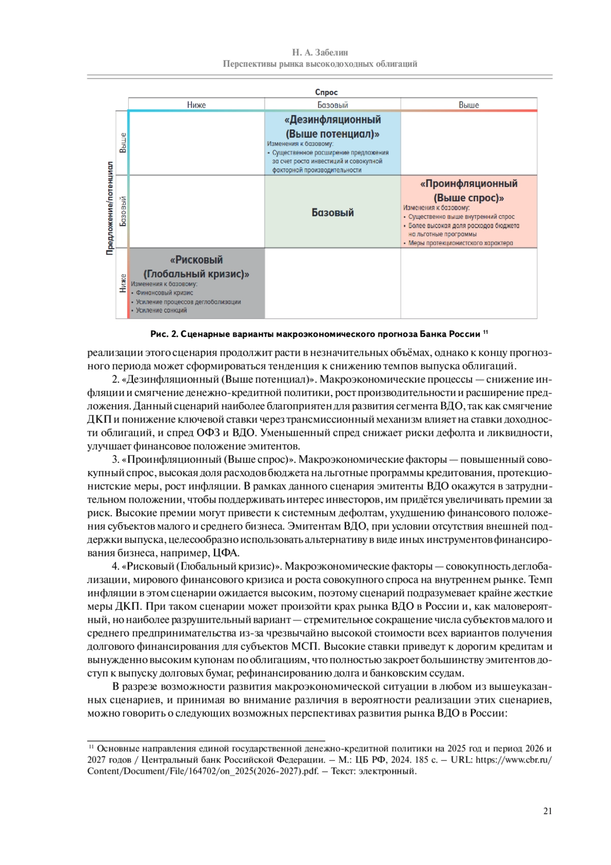 «Дезинфляционный (Выше потенциал)». Макроэкономические процессы — снижение инфляции и смягчение денежно-кредитной политики, рост производительности и расширение предложения. Данный сценарий наиболее благоприятен для развития сегмента ВДО, так как смягчение ДКП и понижение ключевой ставки через трансмиссионный механизм влияет на ставки доходности облигаций, и спред ОФЗ и ВДО. Уменьшенный спред снижает риски дефолта и ликвидности, улучшает финансовое положение эмитентов.