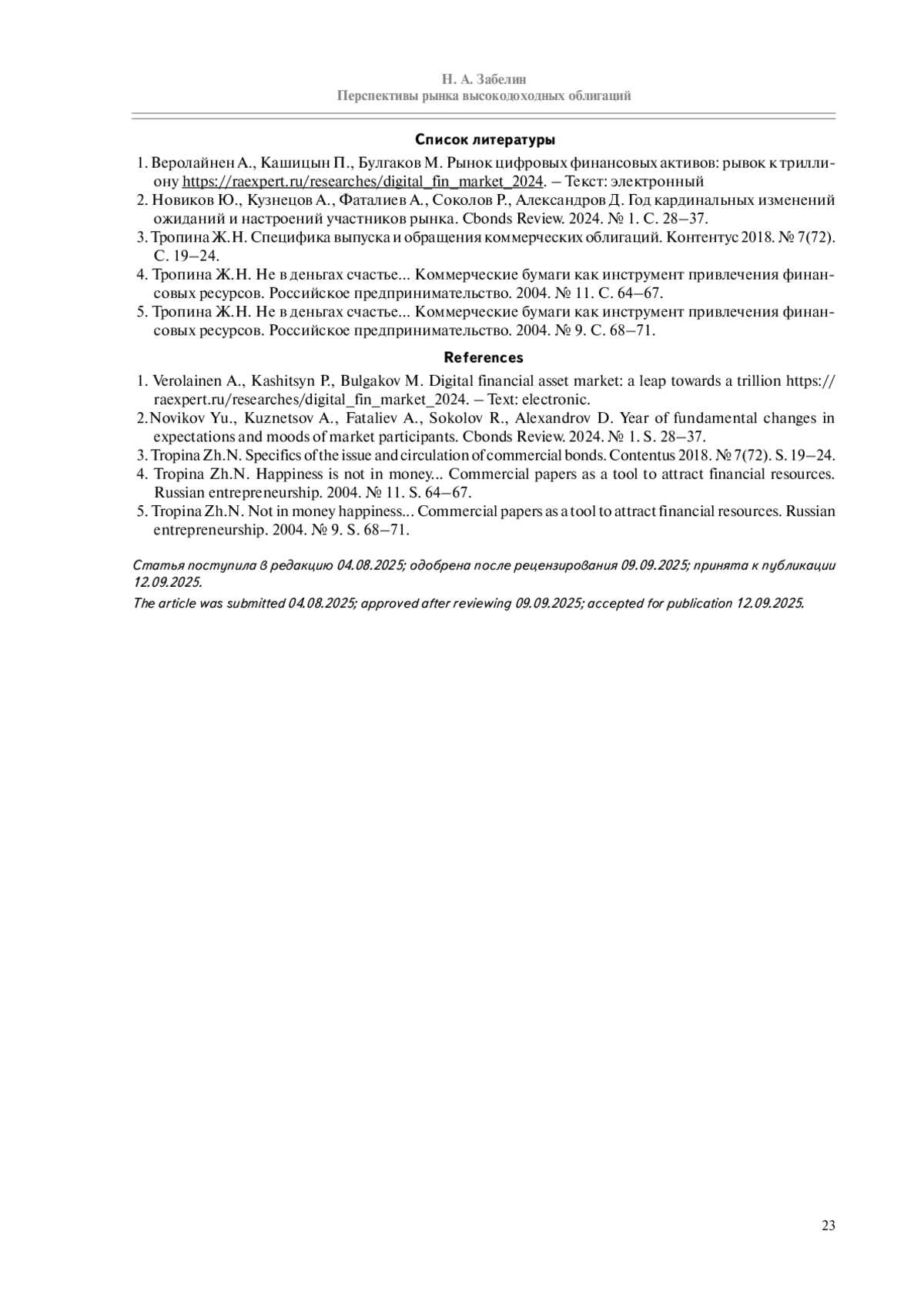 4. Тропина Ж.Н. Не в деньгах счастье… Коммерческие бумаги как инструмент привлечения финансовых ресурсов. Российское предпринимательство. 2004. № 11. С. 64-67.