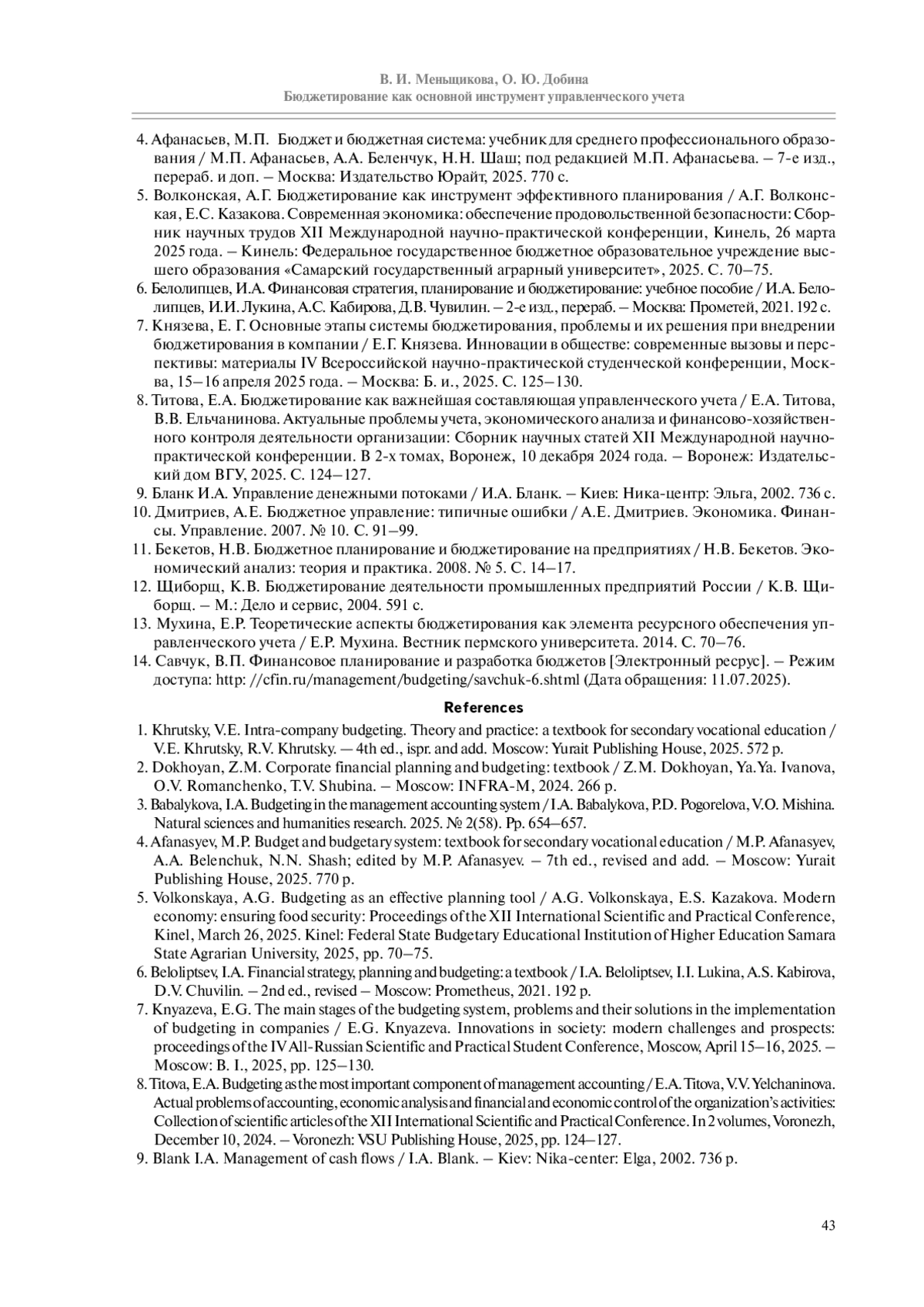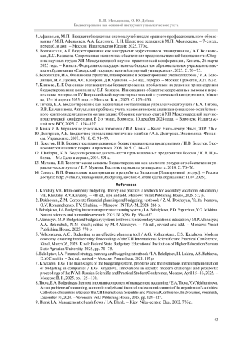 5. Волконская, А.Г. Бюджетирование как инструмент эффективного планирования / А.Г. Волконская, Е.С. Казакова. Современная экономика: обеспечение продовольственной безопасности: Сборник научных трудов XII Международной научно-практической конференции, Кинель, 26 марта 2025 года. - Кинель: Федеральное государственное бюджетное образовательное учреждение высшего образования «Самарский государственный аграрный университет», 2025. С. 70-75.