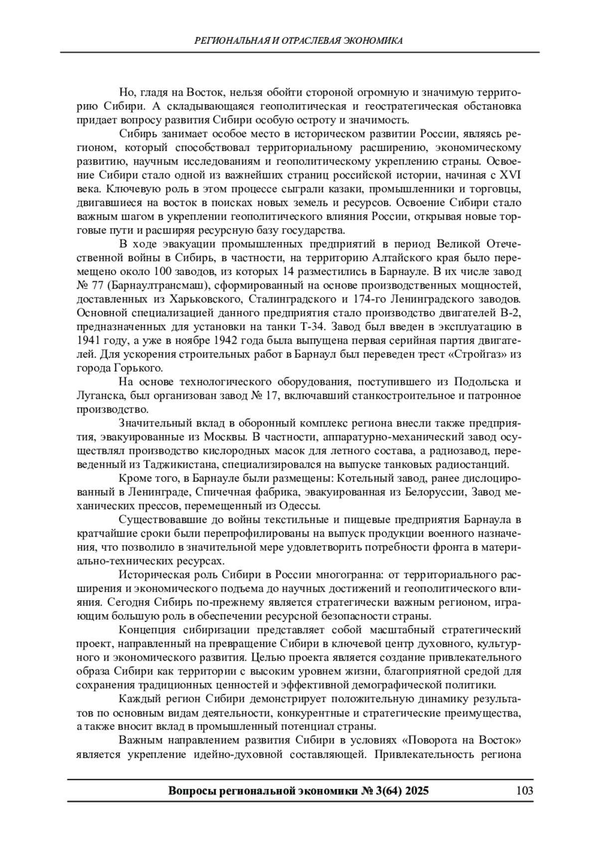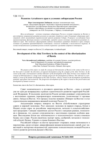 Цель исследования - изучение концепции сибиризации России в условиях поворота на Восток и рассмотрение направлений развития регионов на примере Алтайского края. Концепция сибиризации представляет собой масштабный стратегический проект развития Сибири. В процессе исследования были проанализированы факторы внешнего воздействия, проведен анализ ключевых показателей развития Алтайского края. Это позволило сформировать видение дальнейшего развития Алтайского края, которое основано на развитии производственного потенциала, сельского хозяйства и экологического туризма. В основе поступательного развития региона лежит сохранение и развитие кадрового потенциала.