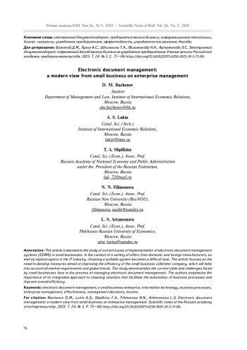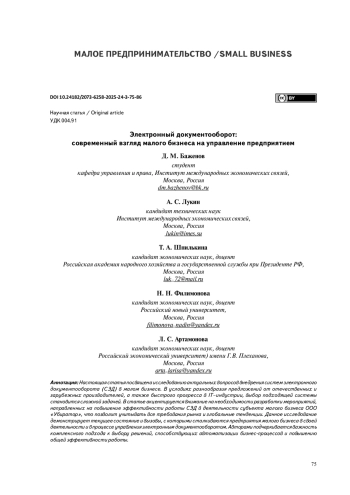 Настоящая статья посвящена исследованию актуальных вопросов внедрения систем электронного документооборота (СЭД) в малом бизнесе. В условиях разнообразия предложений от отечественных и зарубежных производителей, а также быстрого прогресса в IT–индустрии, выбор подходящей системы становится сложной задачей. В статье акцентируется внимание на необходимости разработки мероприятий, направленных на повышение эффективности работы СЭД в деятельности субъекта малого бизнеса ООО «Убиратор», что позволит учитывать все требования рынка и глобальные тенденции. Данное исследование демонстрирует текущее состояние и вызовы, с которыми сталкиваются предприятия малого бизнеса в своей деятельности и в процессе управления электронным документооборотом. Авторами подчеркивается важность комплексного подхода к выбору решений, способствующих автоматизации бизнес>процессов и повышению общей эффективности работы.