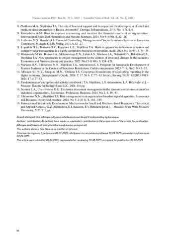 11. Лопаткин Д.С., Борисова О.В., Копылова Л.Е., Шпилькина Т.А. Современные подходы к оценке бизнеса и управление стоимостью компании в высококонкурентной бизнес-среде. Аудит. 2025. № 1(193). С. 34-39.