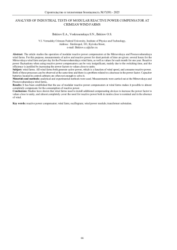 Результаты: Установлено, что применение модульных компенсаторов реактивной мощности на ветроэлектростанциях позволяет практически полностью компенсировать потребление реактивной мощности.