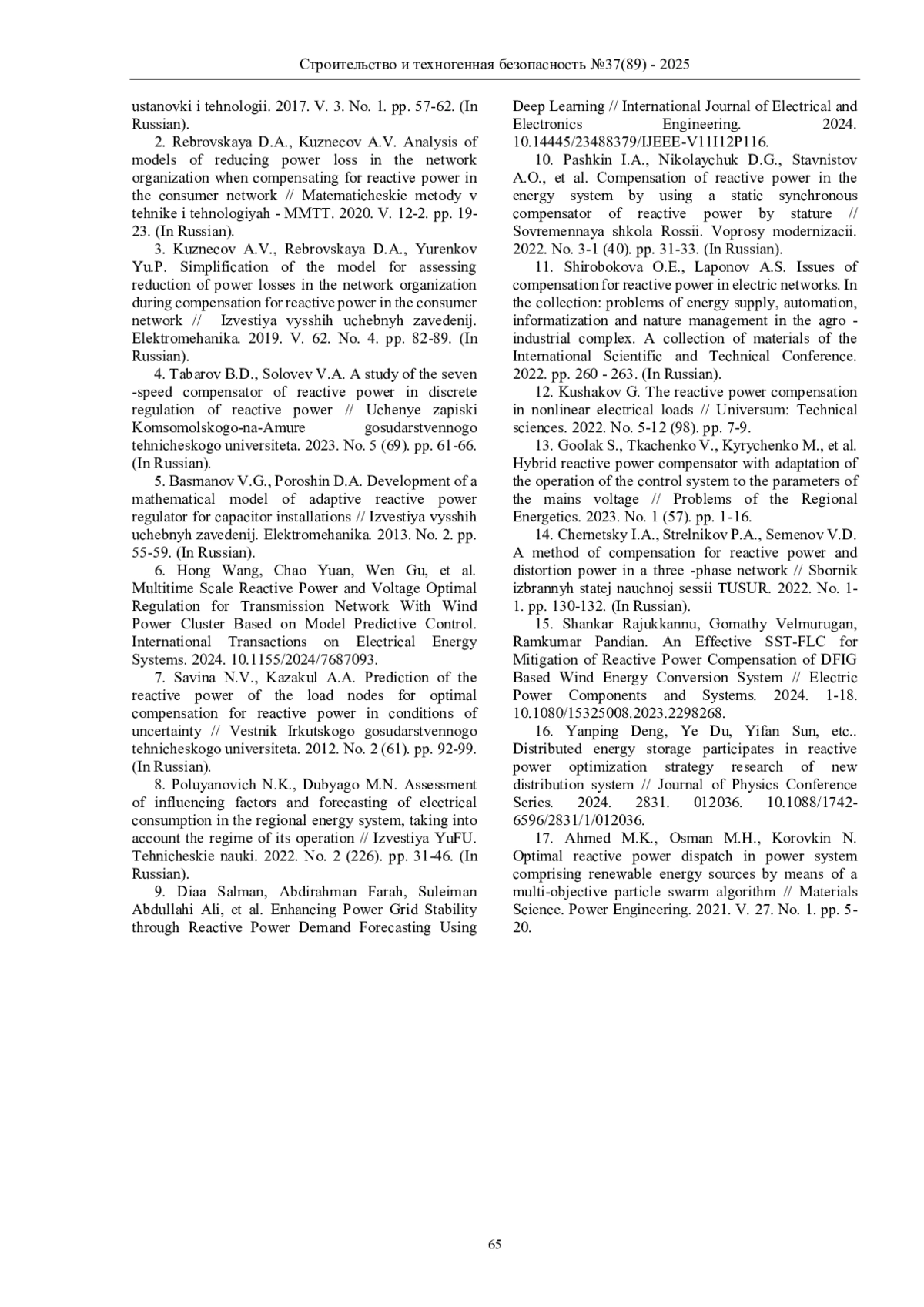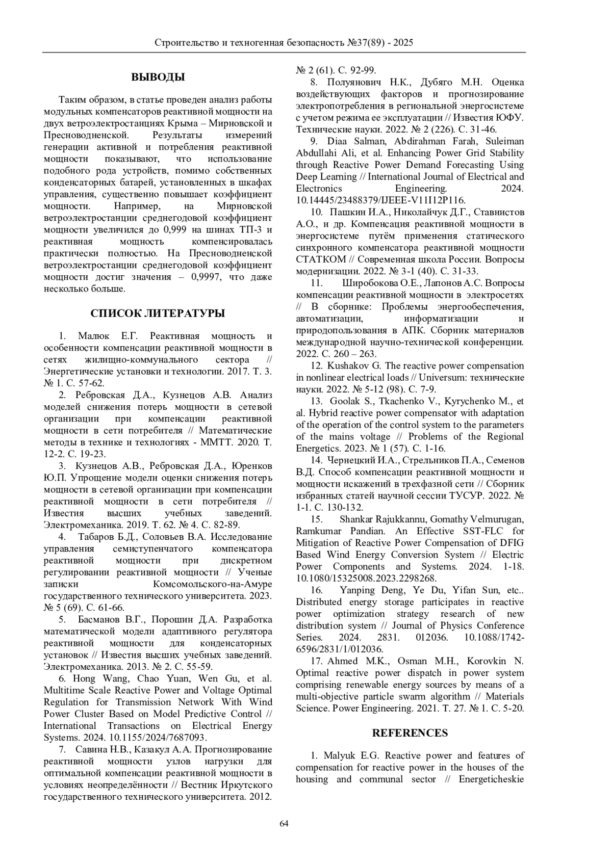 10. Пашкин И.А., Николайчук Д.Г., Ставнистов А.О., и др. Компенсация реактивной мощности в энергосистеме путём применения статического синхронного компенсатора реактивной мощности СТАТКОМ // Современная школа России. Вопросы модернизации. 2022. № 3-1 (40). С. 31-33. EDN: DZXQGL