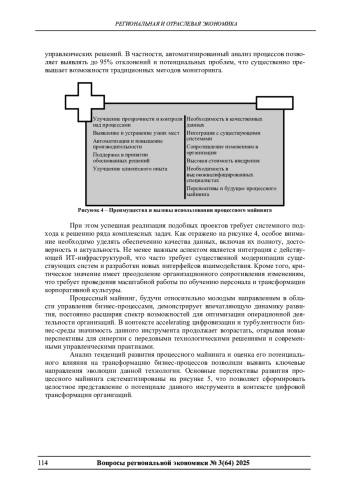 Стремительное развитие цифровых технологий и усиление конкуренции на глобальных рынках требуют от современных предприятий внедрения инновационных инструментов управления бизнес-процессами. Процессный майнинг становится ключевым элементом цифровой трансформации, позволяющим организациям повышать операционную эффективность на основе анализа реальных данных. В статье рассматриваются особенности интеграции процессного майнинга с современными технологиями, анализируются преимущества и вызовы его внедрения, а также перспективы развития в контексте оптимизации бизнес-процессов.