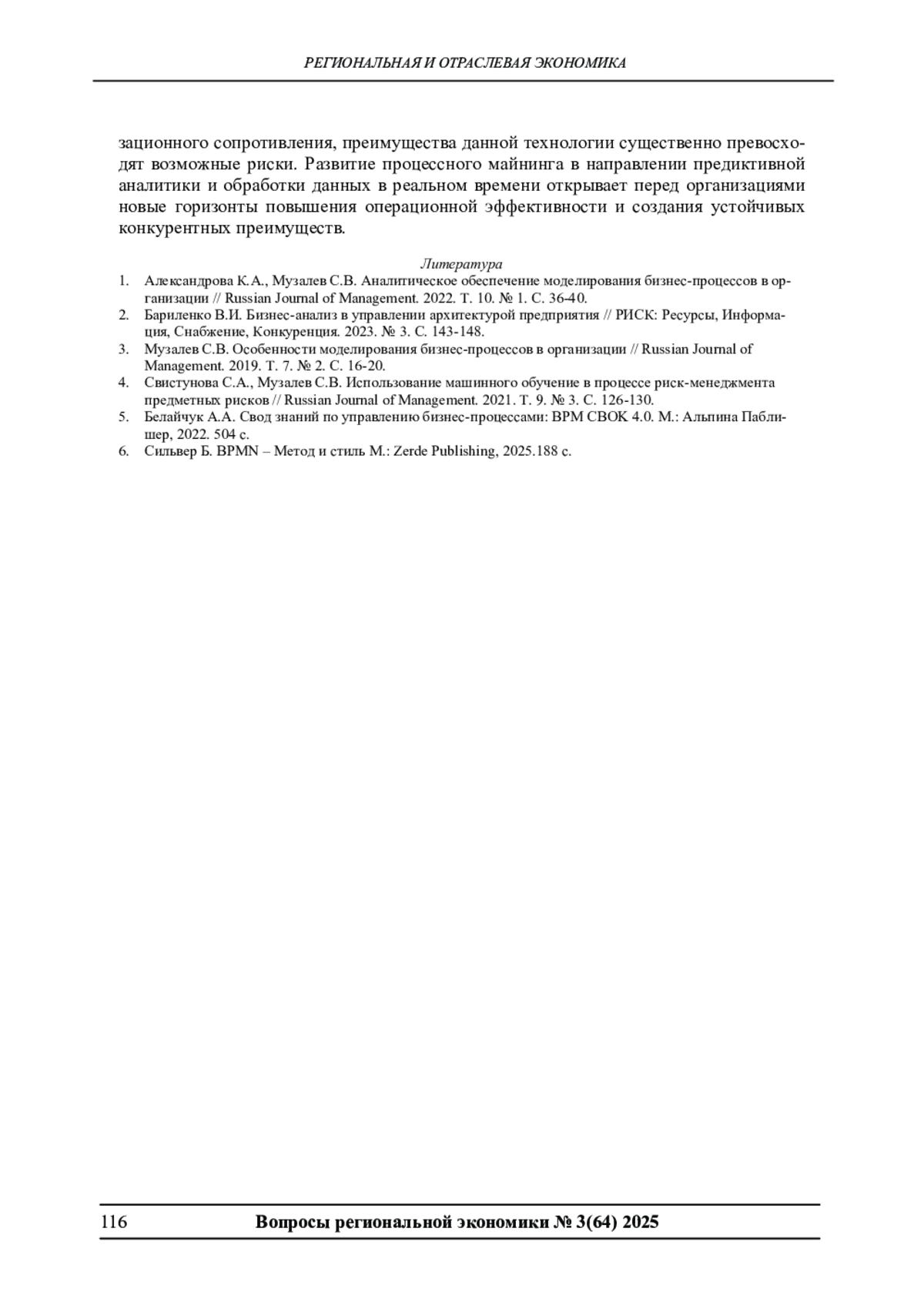 3. Музалев С.В. Особенности моделирования бизнес-процессов в организации // Russian Journal of Management. 2019. Т. 7. № 2. С. 16-20. EDN: ZVYINJ