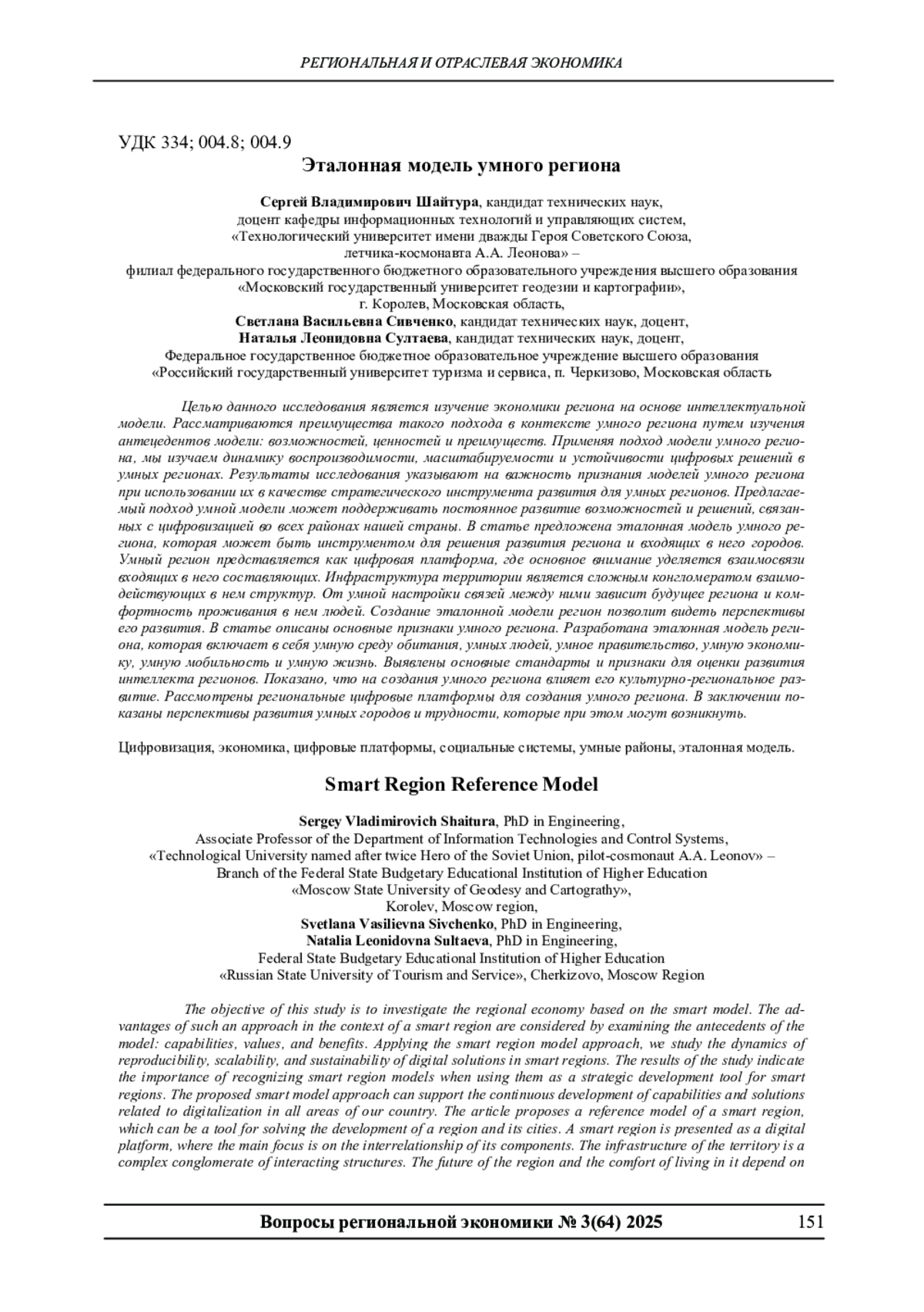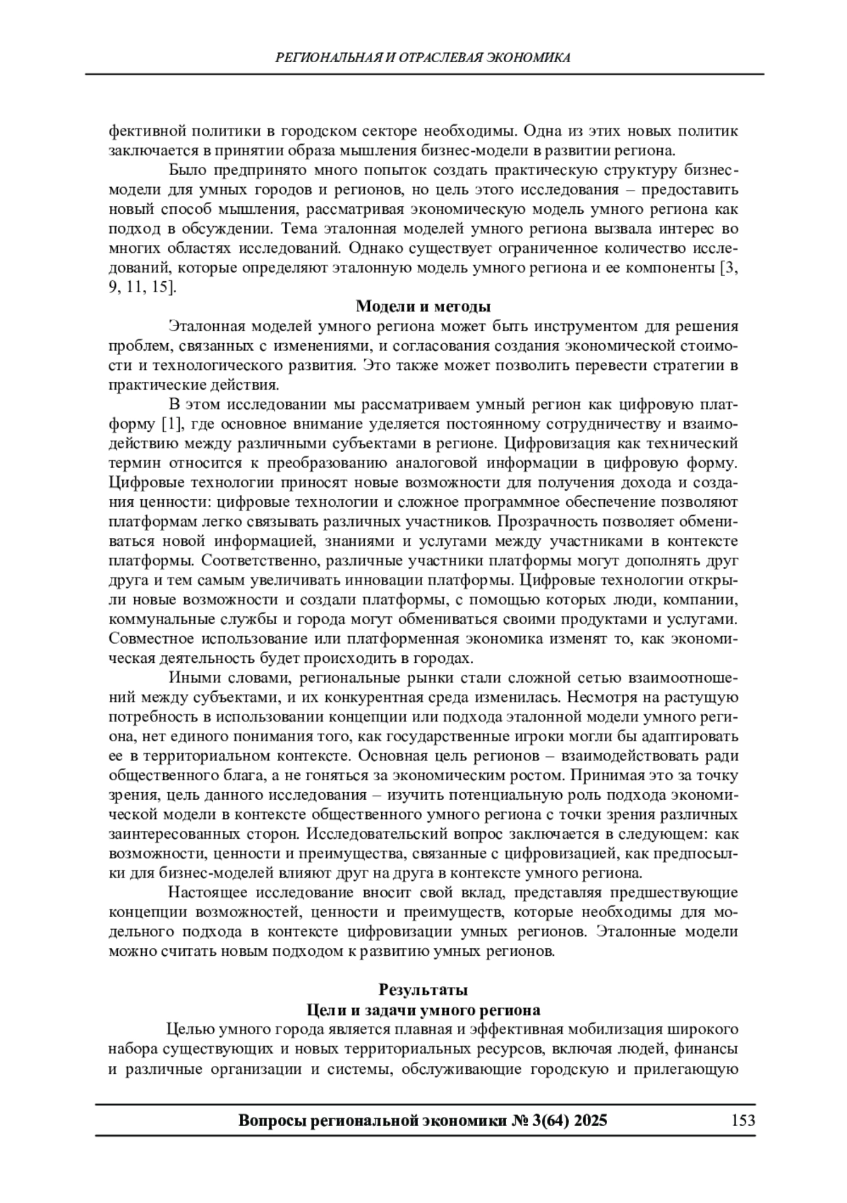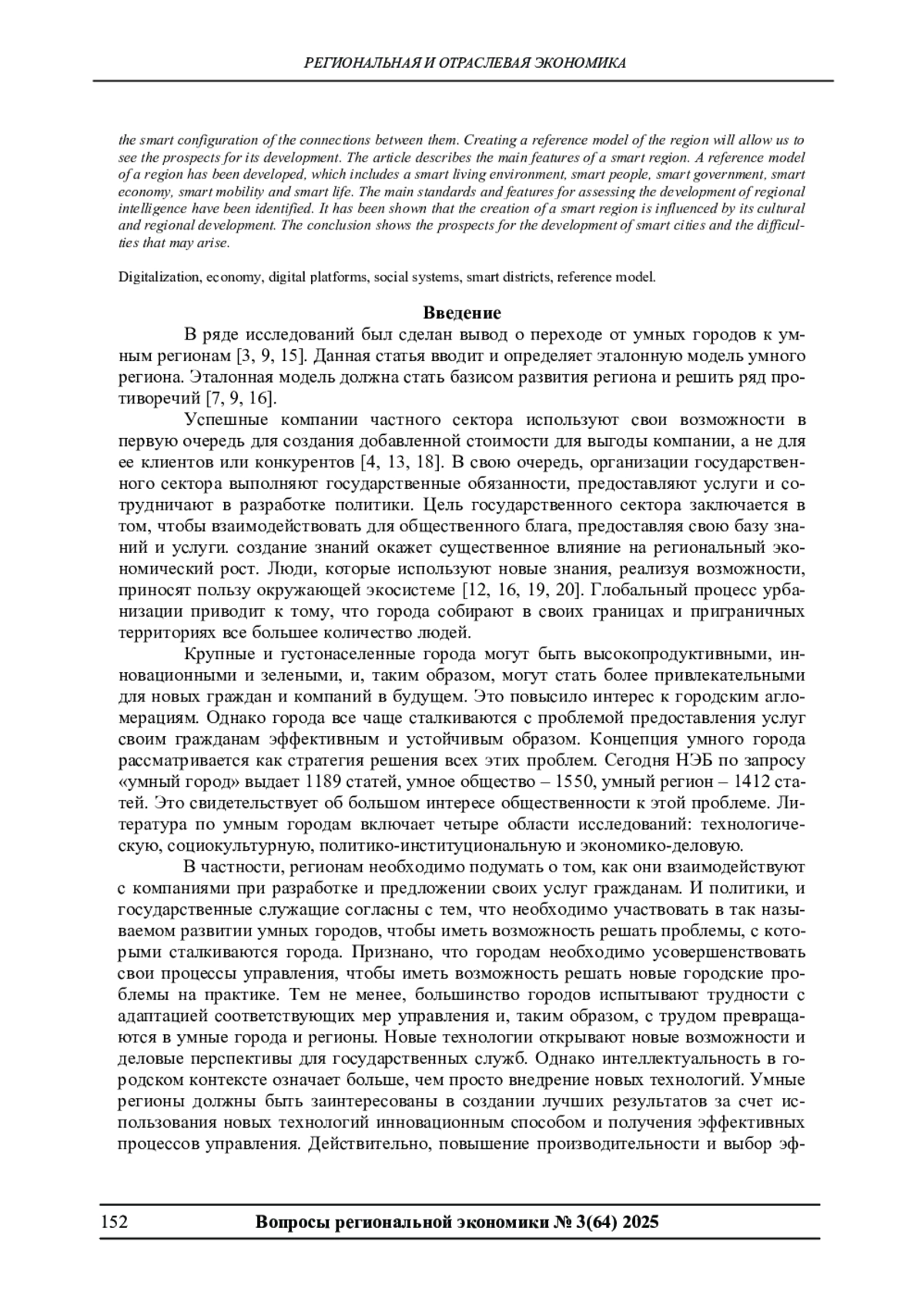 Целью данного исследования является изучение экономики региона на основе интеллектуальной модели. Рассматриваются преимущества такого подхода в контексте умного региона путем изучения антецедентов модели: возможностей, ценностей и преимуществ. Применяя подход модели умного региона, мы изучаем динамику воспроизводимости, масштабируемости и устойчивости цифровых решений в умных регионах. Результаты исследования указывают на важность признания моделей умного региона при использовании их в качестве стратегического инструмента развития для умных регионов. Предлагаемый подход умной модели может поддерживать постоянное развитие возможностей и решений, связанных с цифровизацией во всех районах нашей страны. В статье предложена эталонная модель умного региона, которая может быть инструментом для решения развития региона и входящих в него городов. Умный регион представляется как цифровая платформа, где основное внимание уделяется взаимосвязи входящих в него составляющих. Инфраструктура территории является сложным конгломератом взаимодействующих в нем структур. От умной настройки связей между ними зависит будущее региона и комфортность проживания в нем людей. Создание эталонной модели регион позволит видеть перспективы его развития. В статье описаны основные признаки умного региона. Разработана эталонная модель региона, которая включает в себя умную среду обитания, умных людей, умное правительство, умную экономику, умную мобильность и умную жизнь. Выявлены основные стандарты и признаки для оценки развития интеллекта регионов. Показано, что на создания умного региона влияет его культурно-региональное развитие. Рассмотрены региональные цифровые платформы для создания умного региона. В заключении показаны перспективы развития умных городов и трудности, которые при этом могут возникнуть.