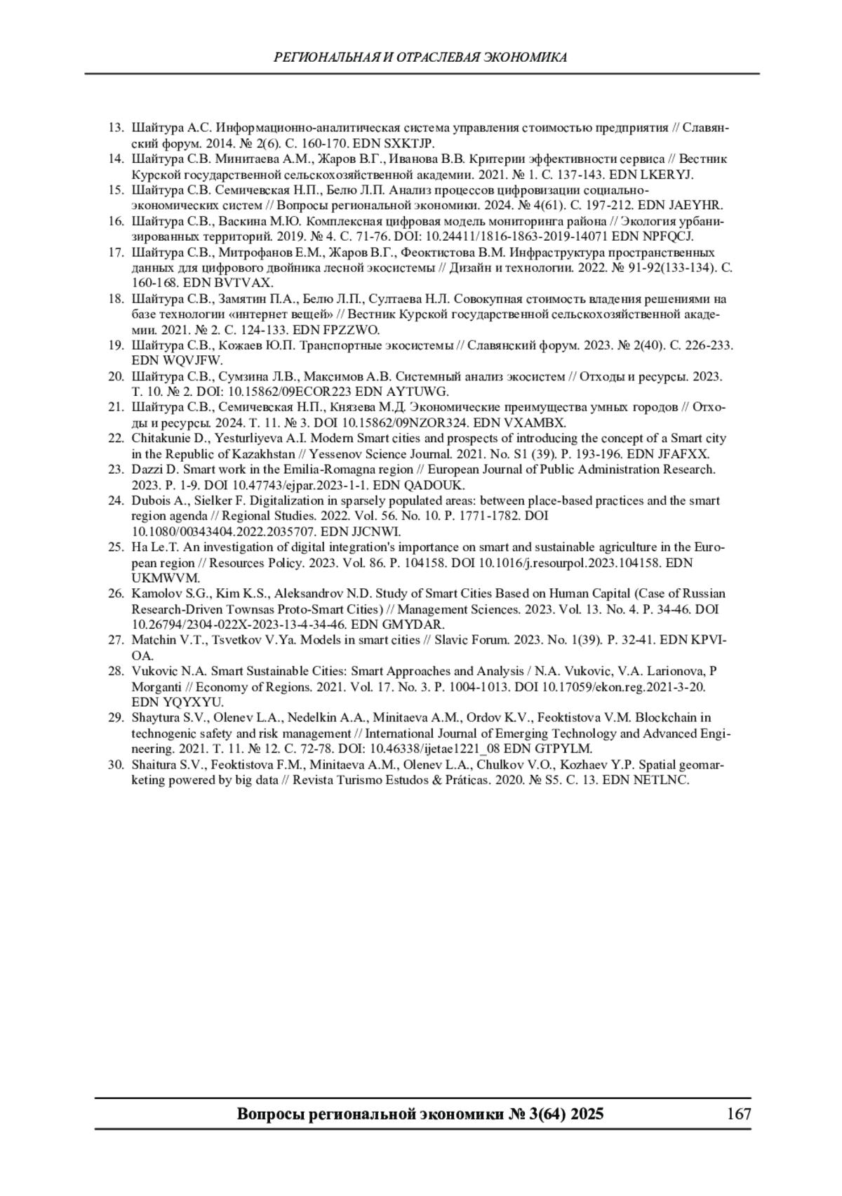 15. Шайтура С.В. Семичевская Н.П., Белю Л.П. Анализ процессов цифровизации социально-экономических систем // Вопросы региональной экономики. 2024. № 4(61). С. 197-212. EDN: JAEYHR