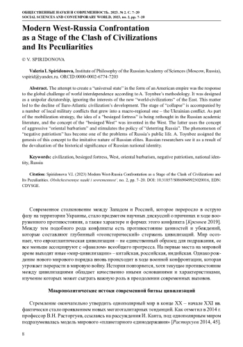 Современное столкновение между Западом и Россией, которое переросло в острую фазу на территории Украины, стало предметом научных дискуссий о причинах и ходе вооруженного противостояния, а также характере и формах этого конфликта [Кремнев 2019]. Между тем подобного рода конфликты есть противостояние ценностей и убеждений, которые составляют глубинный «геоисторический» стержень цивилизаций. Мир осознает, что евроатлантическая цивилизация – не единственный образец для подражания, ее все меньше ассоциируют с «факелом» всеобщего прогресса. На первые места на мировой арене выходят иные «мир-цивилизации» – китайская, российская, индийская. Однако рождение нового мирового порядка вновь происходит в ходе военной конфронтации, которая угрожает перерасти в мировую войну. История повторяется, хотя текущее противостояние между цивилизациями обладает качественно иными основаниями и характеристиками, изучение которых может сыграть важную роль в преодолении современных вызовов