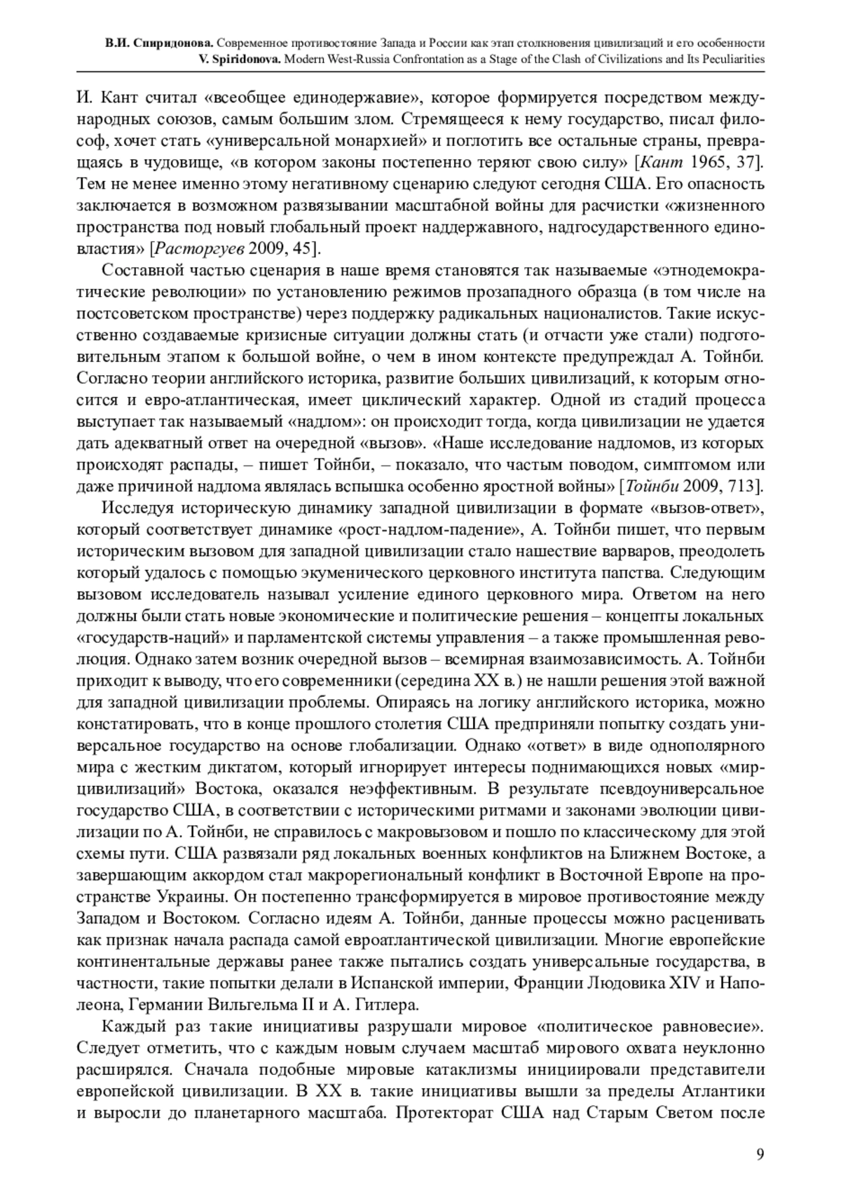 Попытка создать «универсальное государство» в виде американской империи, по методологии А. Тойнби, стала «ответом» на глобальный вызов всемирной взаимозависимости. Американская империя была оформлена как мировая диктатура, которая игнорировала интересы новых мирцивилизаций Востока. В результате возникла ситуация «надлома» в развитии евро-атлантической цивилизации, которая выразилась в серии локальных военных конфликтов. На современном этапе они переросли в макрорегиональный – украинский конфликт. На этом фоне в рамках мобилизационной стратегии в российской научной литературе переосмысливают идею «осажденной крепости». В Европе формулируется концепция «осажденного Запада», которая развивает представления об агрессивном «восточном варварстве» и стимулирует политику «сдерживания России». Одной из проблем внутренней жизни России стал «негативный патриотизм», генезис которого обусловлен, по А. Тойнби, имитационным характером русской элиты. Российские исследователи считают, что данное явление стало результатом обесценивания исторической значимости русской национальной идентичности