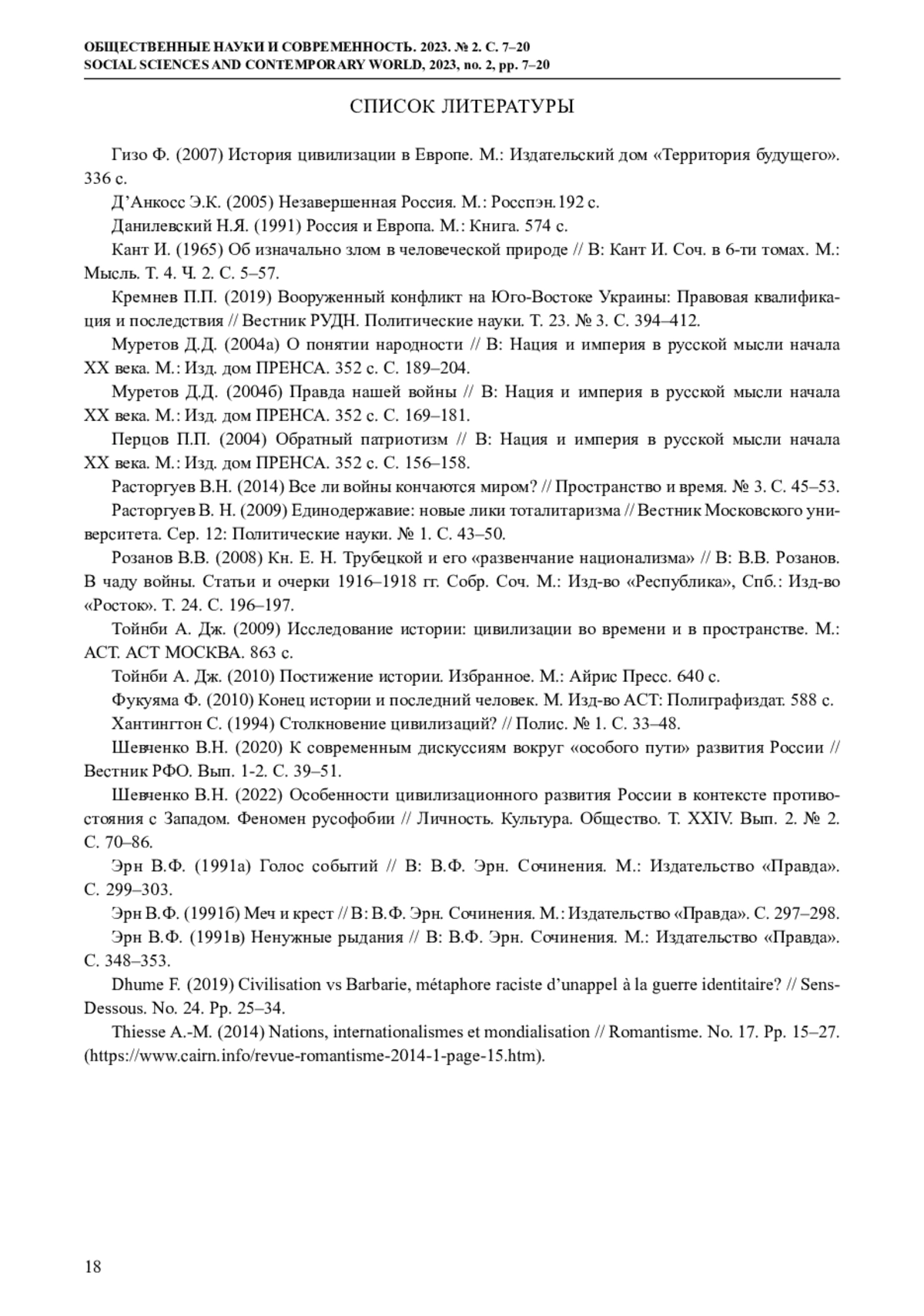 17. Шевченко В.Н. (2022) Особенности цивилизационного развития России в контексте противостояния с Западом. Феномен русофобии // Личность. Культура. Общество. Т. XXIV. Вып. 2. № 2. С. 70-86. EDN: GHXXOF
