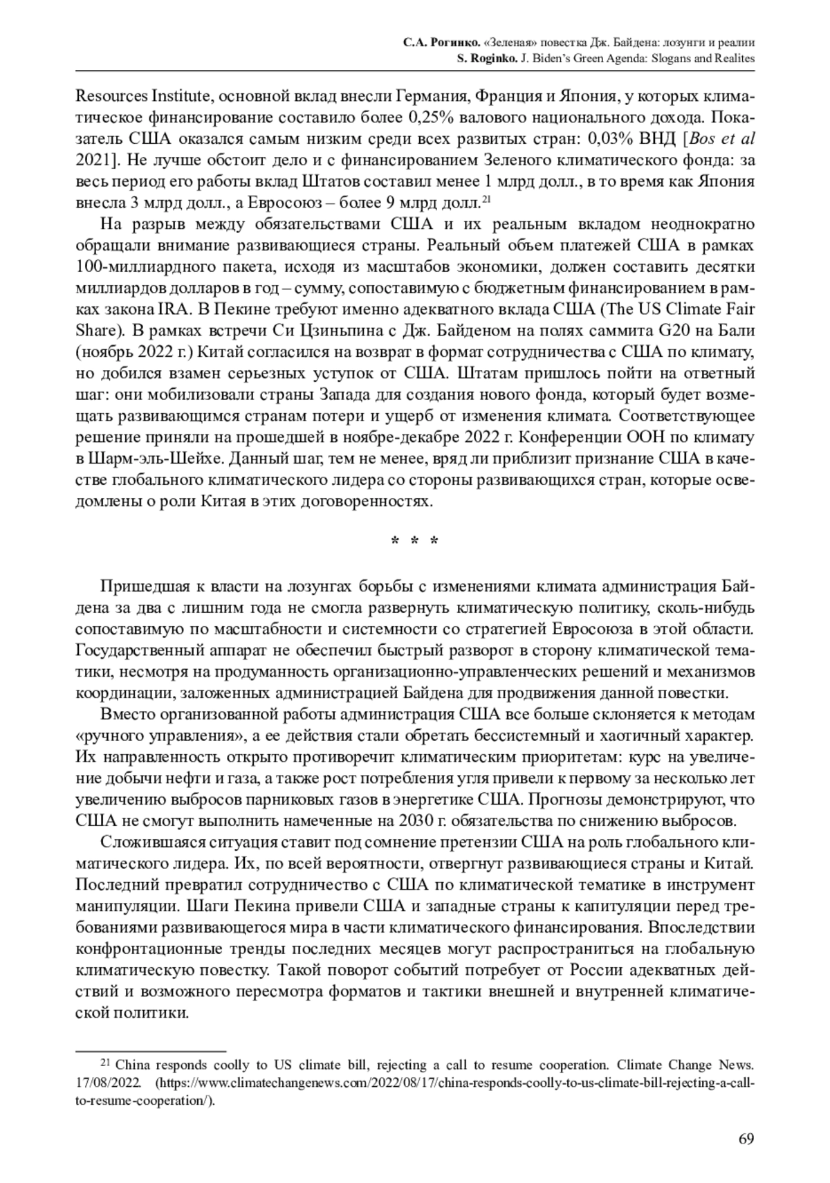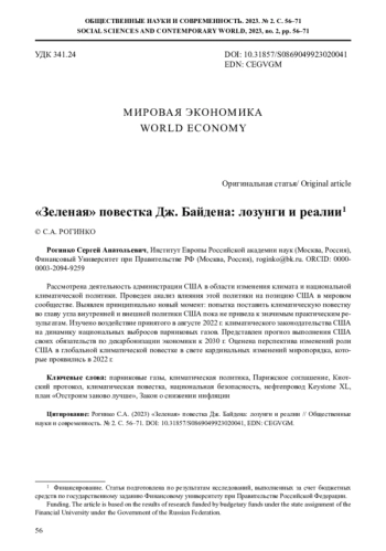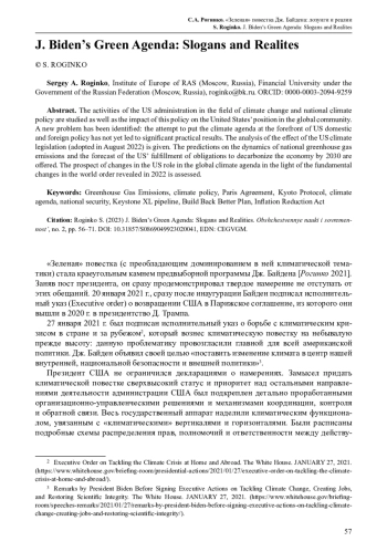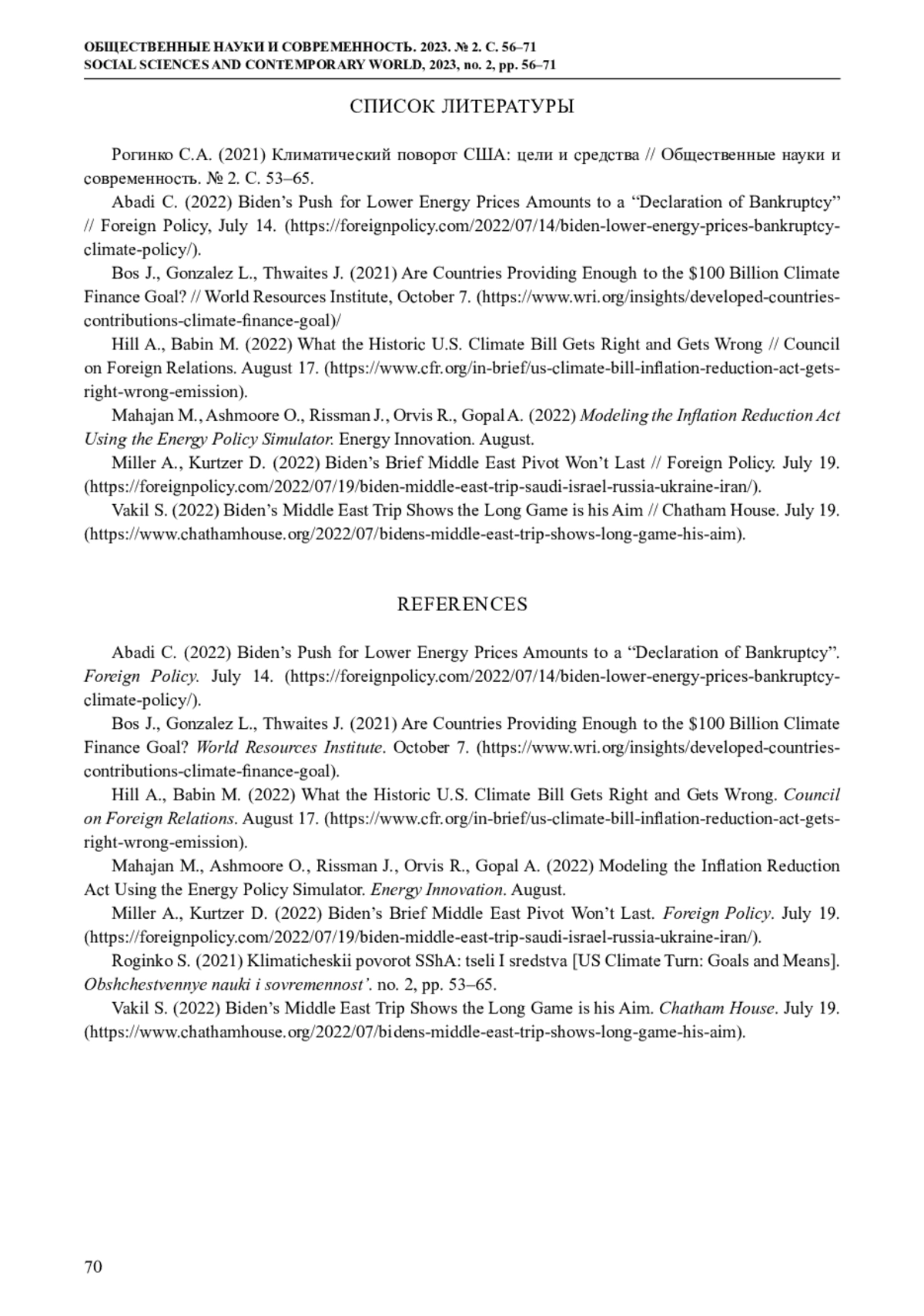 1. Рогинко С.А. (2021) Климатический поворот США: цели и средства // Общественные науки и современность. № 2. С. 53-65. EDN: OIKZNZ