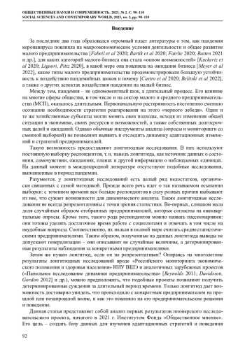 За последние два года образовался огромный пласт литературы о том, как пандемия коронавируса повлияла на макроэкономические условия деятельности и общее развитие малого предпринимательства [Fabeil et al 2020; Bartik et al 2020; Fairlie 2020; Ratten 2021 и др.], для каких категорий малого бизнеса она стала «окном возможностей» [Kuckertz et al 2020; Liguori, Pittz 2020], в какой мере она повлияла на ожидания бизнеса [Meyer et al 2022], какие типы малого предпринимательства продемонстрировали большую устойчивость к воздействию пандемийных шоков и почему [Castro et al 2020; Belitski et al 2022], а также о других аспектах воздействия пандемии на малый бизнес.