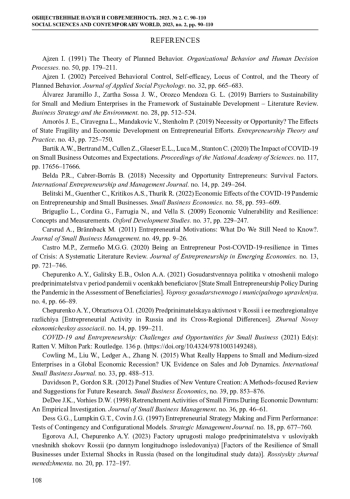 1. Егорова А.И., Чепуренко А.Ю. (2023) Факторы упругости малого предпринимательства в условиях внешних шоков в России (по данным лонгитюдного исследования) // Российский журнал менеджмента. № 1. С. 172-197.