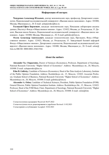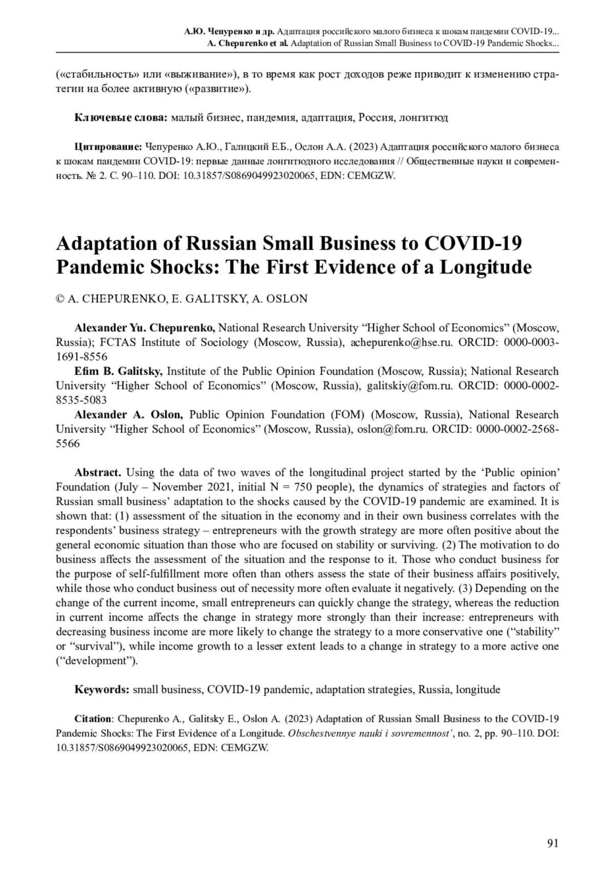 На данных двух волн лонгитюдного проекта ООО Институт Фонда «Общественное мнение» (июль – ноябрь 2021 г., исходный N = 750 человек) рассмотрены в динамике стратегии и факторы адаптации российского малого бизнеса к потрясениям, вызванным пандемией COVID-19. Показано, что: (1) оценка респондентами ситуации в экономике и в собственном бизнесе коррелирует с их бизнес-стратегией – предприниматели, которые стремятся к росту своего бизнеса, чаще положительно оценивают общую экономическую ситуацию, чем те, кто ориентирован на стабильность или выживание своего бизнеса. (2) Бизнес-мотивация влияет на оценку ситуации и реакцию на нее. Те, кто ведет бизнес с целью самореализации, чаще других оценивают положение дел в своем бизнесе положительно, в то время как ведущие бизнес вынужденно чаще оценивают его негативно. (3) Малые предприниматели могут менять стратегию в зависимости от динамики текущих доходов, причем их сокращение влияет на изменение стратегии сильнее, чем увеличение: предприниматели с уменьшающимся доходом бизнеса с большей вероятностью изменят стратегию на более консервативную («стабильность» или «выживание»), в то время как рост доходов реже приводит к изменению стратегии на более активную («развитие»)