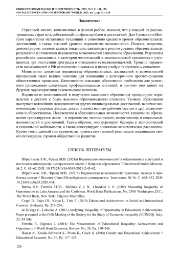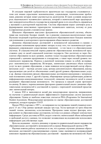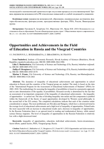 Изучена динамика неравенства образовательных достижений и возможностей в сегменте школьного образования в России и странах Вишеградской группы. Исследование основано на данных «Международной программы по оценке образовательных достижений учащихся» (PISA) за 2003– 2018 гг. Научная новизна работы заключается в оценке несправедливого компонента неравенства образовательных достижений как неравенства возможностей. Идея разделения неравенства на несправедливый и справедливый компоненты обоснована теорией равных возможностей, которую разработали во второй половине ХХ в. в западной социальной философии. Неравенство возможностей оценено с помощью параметрической методики, базирующейся на упреждающем подходе к определению равенства возможностей. Проведенные расчеты свидетельствуют о том, что каждая из рассматриваемых стран уникальна. Словакия и Венгрия наиболее проблемны, что выражается в тенденции к снижению среднего уровня образовательных достижений и высоком уровне неравенства возможностей. Наиболее благополучной выглядит Польша, в которой растут образовательные достижения и снижается уровень неравенства возможностей. В РФ наблюдается тенденция к росту читательской и математической грамотности при отсутствии прогресса в естественнонаучной. Уровень неравенства возможностей в РФ относительно невысокий со слабой тенденцией к снижению