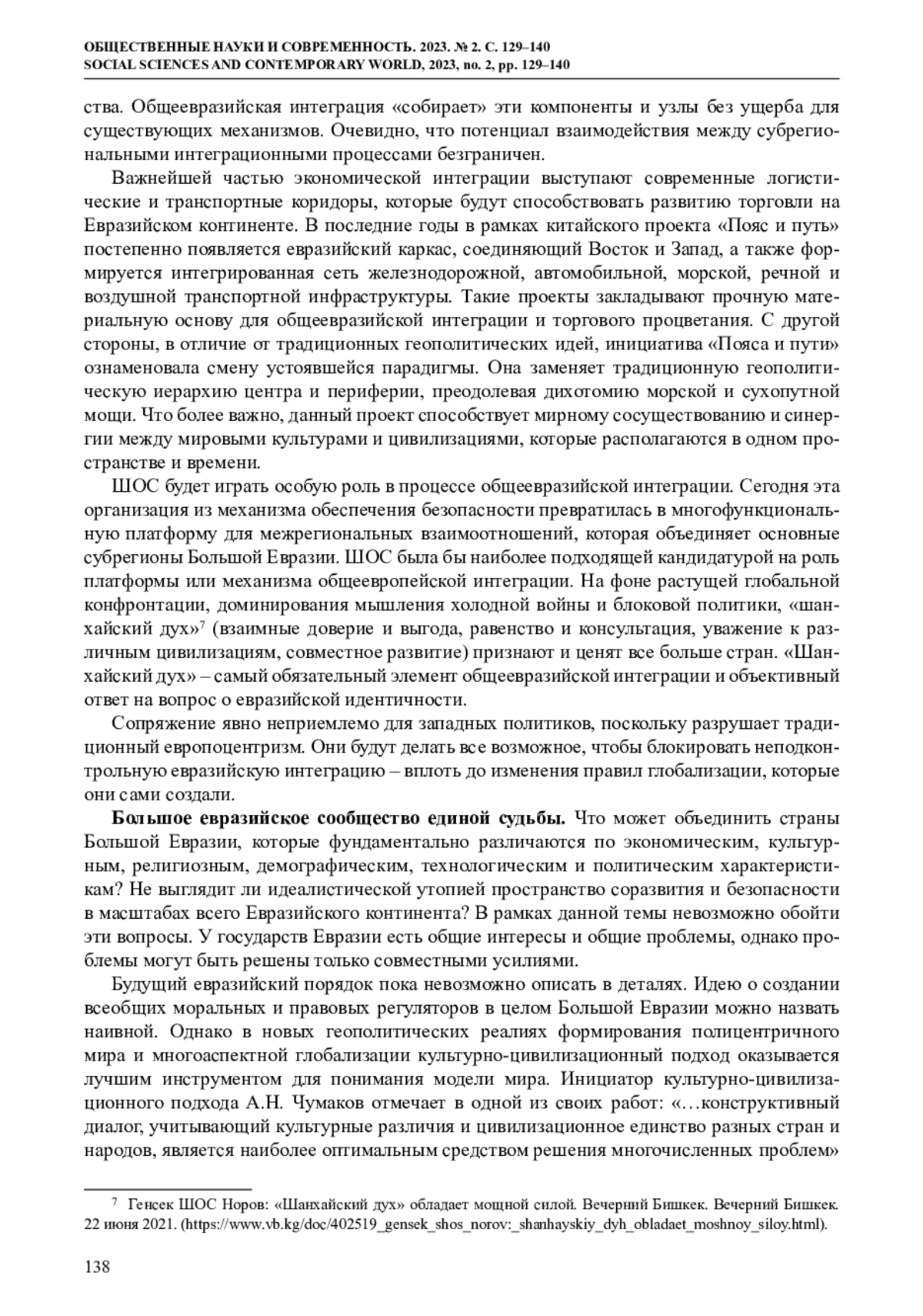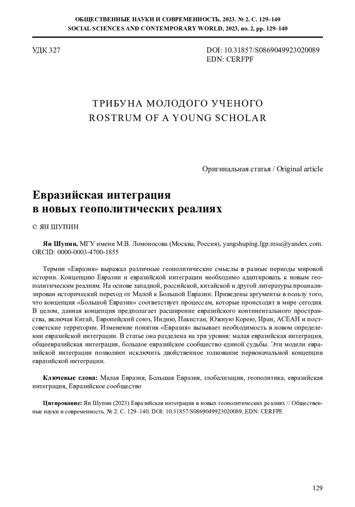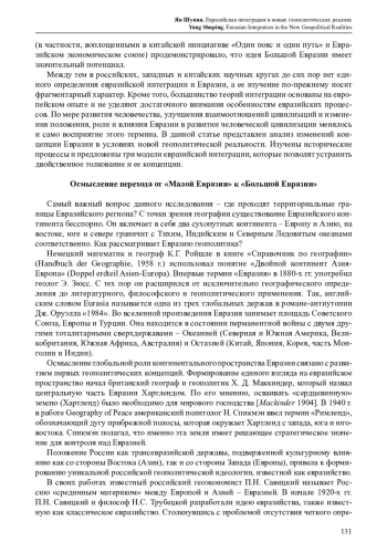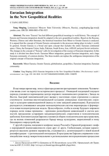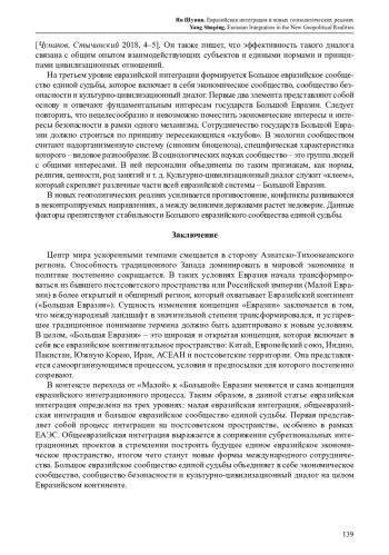 Термин «Евразия» выражал различные геополитические смыслы в разные периоды мировой истории. Концепцию Евразии и евразийской интеграции необходимо адаптировать к новым геополитическим реалиям. На основе западной, российской, китайской и другой литературы проанализирован исторический переход от Малой к Большой Евразии. Приведены аргументы в пользу того, что концепция «Большой Евразии» соответствует процессам, которые происходят в мире сегодня. В целом, данная концепция предполагает расширение евразийского континентального пространства, включая Китай, Европейский союз, Индию, Пакистан, Южную Корею, Иран, АСЕАН и постсоветские территории. Изменение понятия «Евразия» вызывает необходимость в новом определении евразийской интеграции. В статье она разделена на три уровня: малая евразийская интеграция, общеевразийская интеграция, большое евразийское сообщество единой судьбы. Эти модели евразийской интеграции позволяют исключить двойственное толкование первоначальной концепции евразийской интеграции