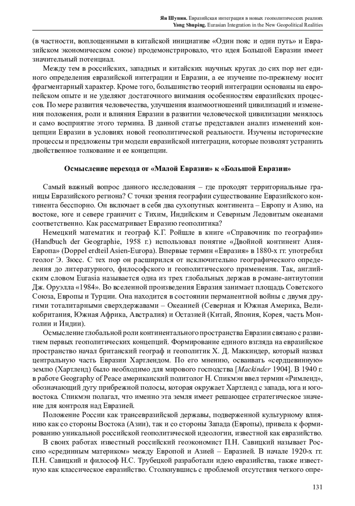 8. Mackinder H.J. (1904) The Geographical Pivot of History // The Geographical Journal. No. 23. Pp. 421-437.