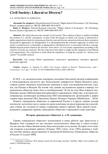 Статья посвящена концепции гражданского общества. Кратко рассмотрена эволюция представлений о ней, в том числе развитие L- и M-представлений. В рамках исследования М-концепции, в которой под гражданским обществом понимают относительно автономные от государства общественные организации и многообразные связи между ними, выделены нормативный и позитивистский подходы. Обосновано утверждение, что нормативный подход, согласно которому гражданское общество рассматривают как сообщество организаций с либеральными взглядами, заимствовует представления из L-концепции. Проанализированы современные российские тренды, связанные с разделением организаций гражданского общества по критерию лояльности «сверху». Предпринята попытка выделить категории нелиберальных гражданских организаций. Представлен вывод о целесообразности использовать концепцию «разнообразного гражданского общества» в научном анализе