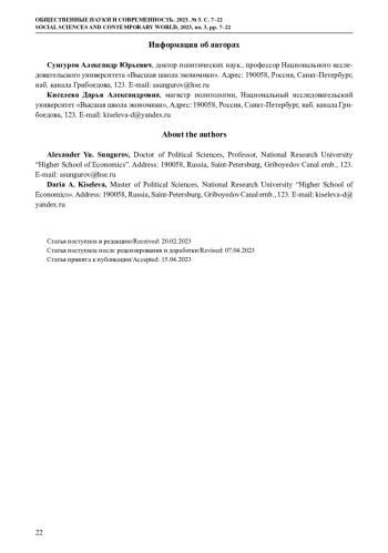Рассмотрена проблема геополитического выбора Армении в контексте мир-системного анализа и истории Армении XX – начала XXI вв. Выдвинут тезис о том, что геополитическая конфигурация в Закавказье сегодня и 100 лет назад схожи. Армении следует учитывать данный фактор, чтобы делать адекватный геополитический выбор современных условиях. Приведена динамика отношения армянского общества к России как наилучшему союзнику республики и к Франции как к основному конкуренту России в Армении (2011–2022 гг.). В данном контексте изучено, как 44-дневная Карабахская война повлияла на отношение в Армении к Большому российскому пространству. Применены два индикатора – отношение к СССР и отношение к присоединению Армении к Союзному государству России и Беларуси. Идентифицированы системы аргументаций «за» и «против» СССР и то, как они изменились в результате 44-дневной войны. Выделены факторы, которые влияют на отношение общества к Большому российскому пространству. Произведена сегментация армянского общества на пророссийский, прозападный, смешанный и не имеющий акцентированной ориентации секторы. Оценены объемы этих сегментов, проведен сравнительный анализ их основных характеристик: уровень лояльности к политическому курсу страны, электоральное участие, информационные предпочтения, доверие к государственным и общественным институтам. Представленный эмпирический материал получен вторичным анализом баз данных общереспубликанских репрезентативных социологических опросов «Кавказский барометр» за 2011–2022 гг. Кавказских центров исследовательских ресурсов. Приведены также результаты других общереспубликанских социологических исследований