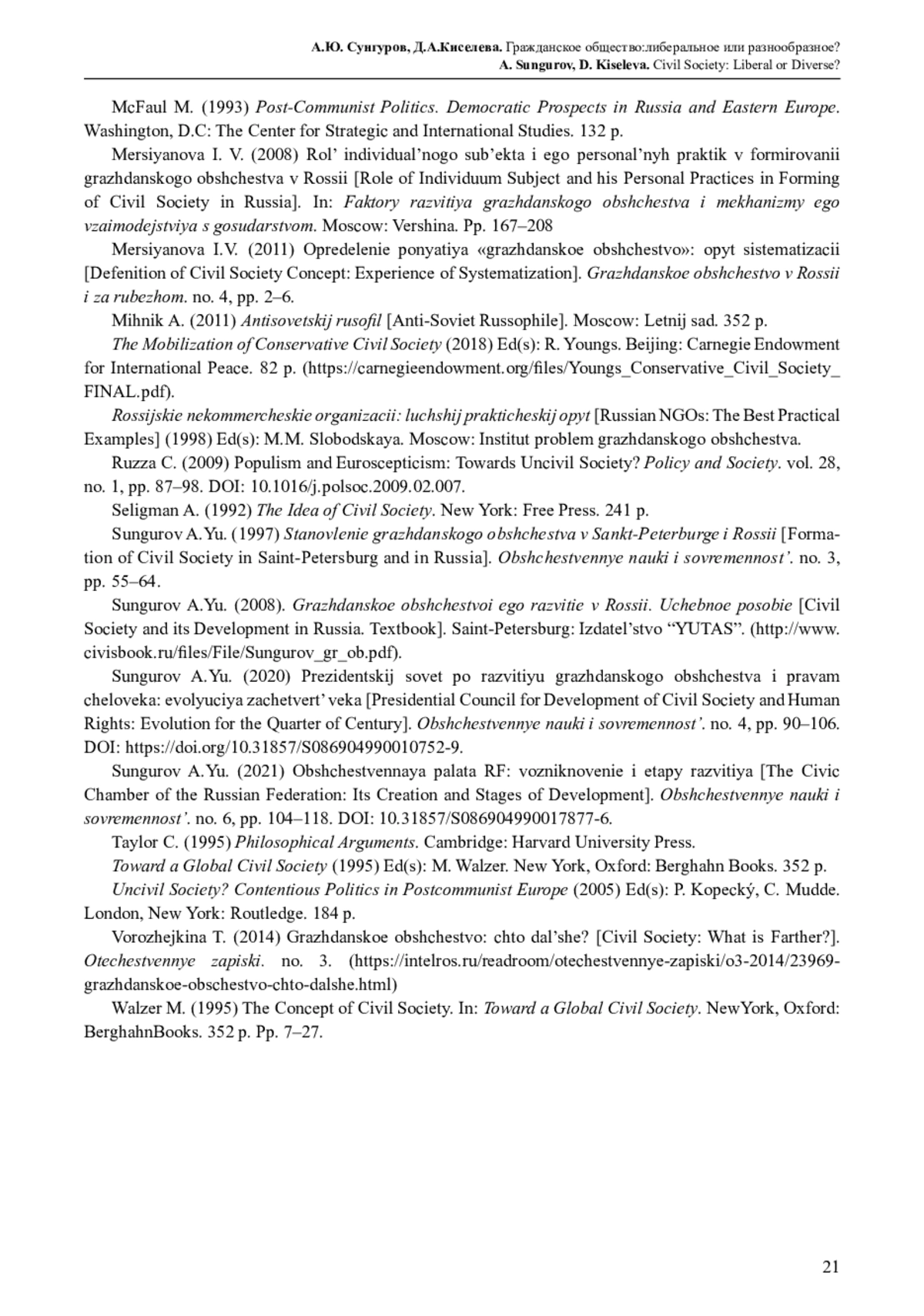 13. Сунгуров А.Ю. (1997) Становление гражданского общества в Санкт-Петербурге и России // Общественные науки и современность. № 3. С. 55-64.