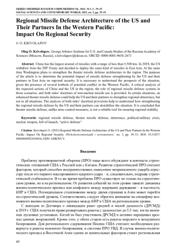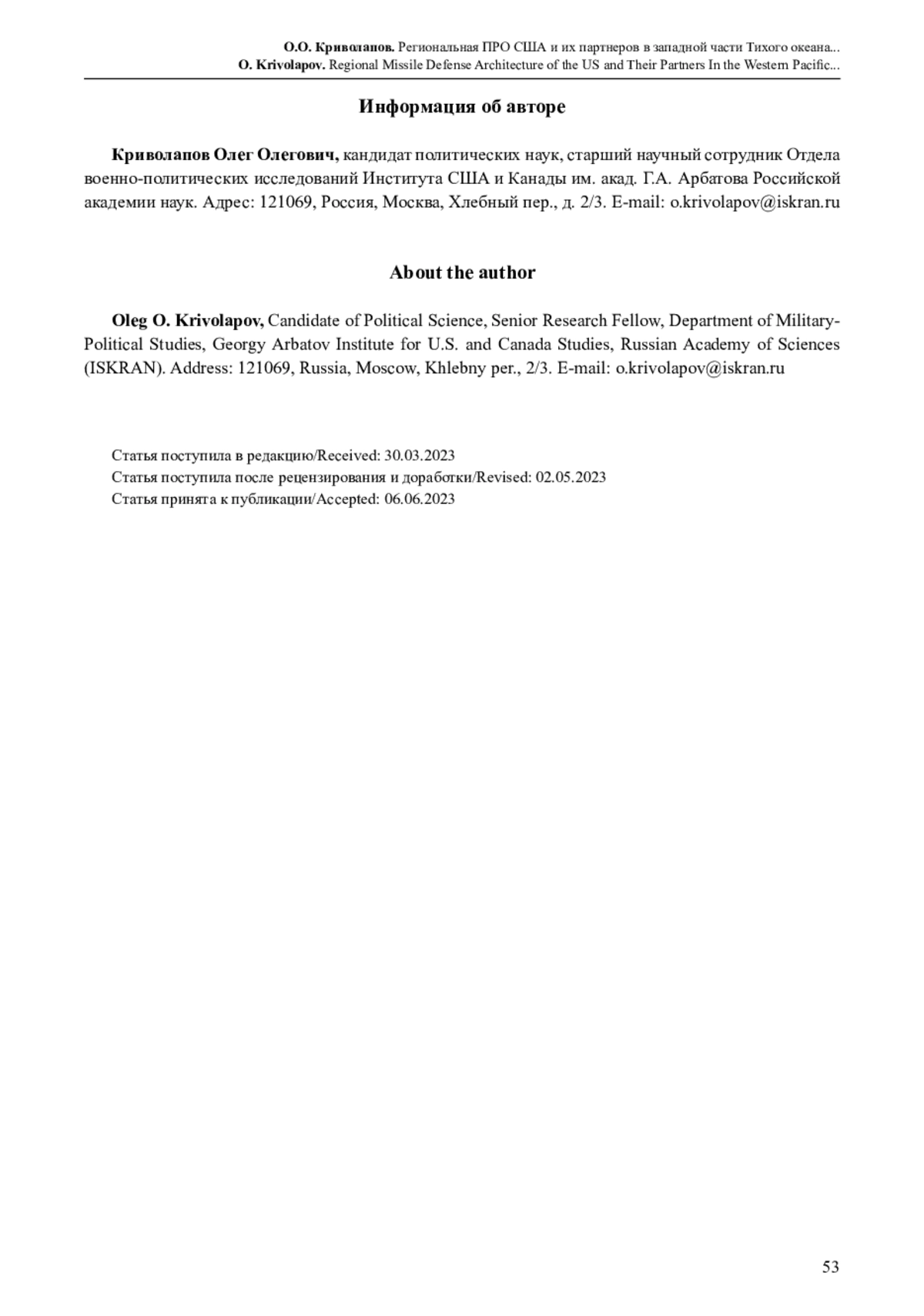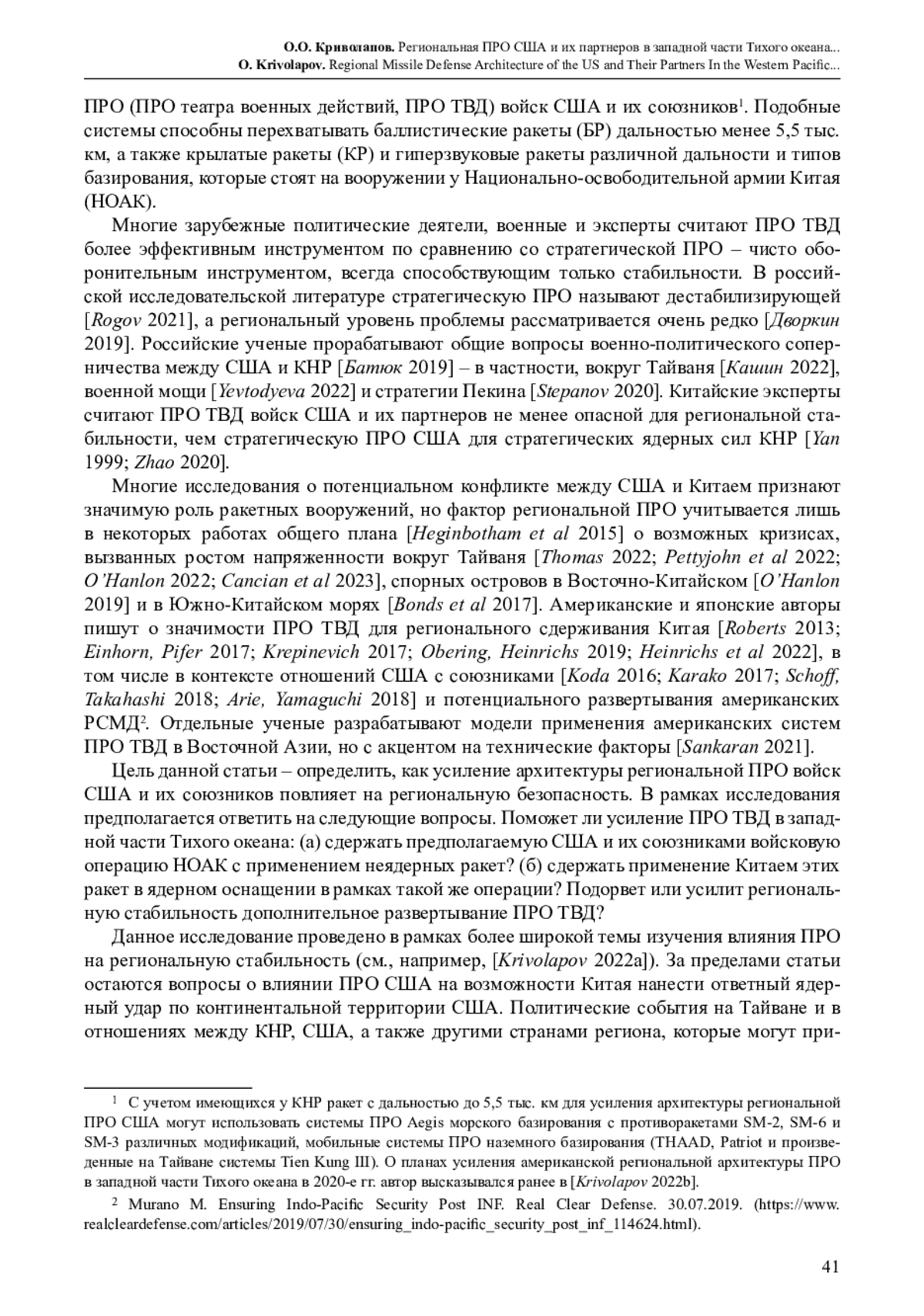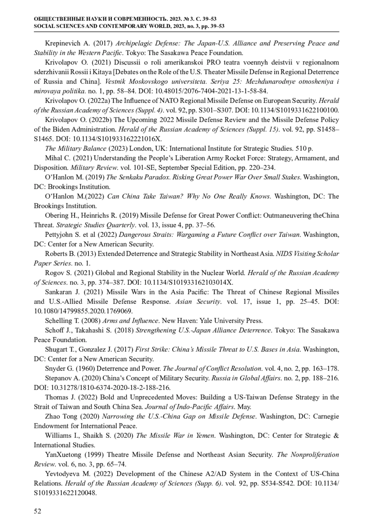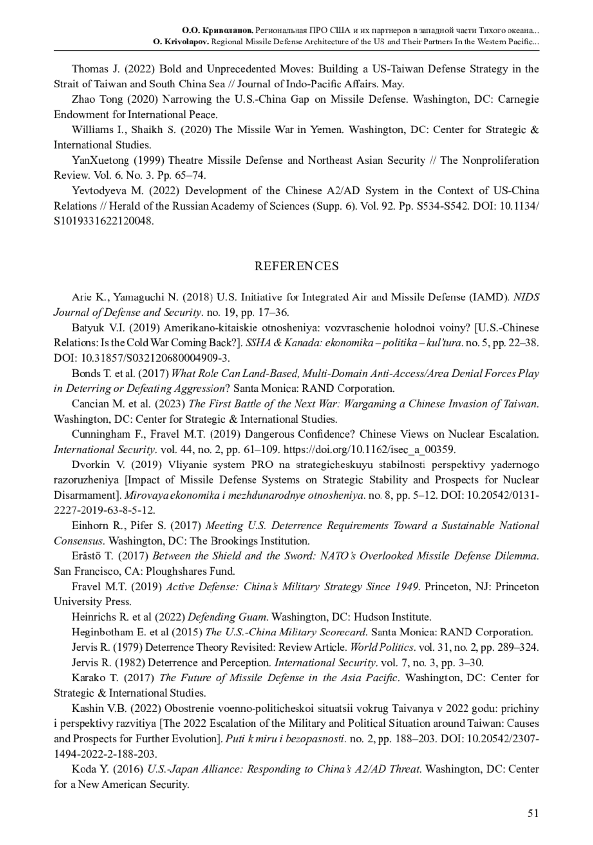 4. Криволапов О.О. (2021) Дискуссии о роли американской ПРО театра военных действий в региональном сдерживании России и Китая // Вестник Московского университета. Серия 25: Международные отношения и мировая политика. № 1. С. 58-84. DOI: 10.48015/2076-7404-2021-13-1-58-84 EDN: OKXYAF