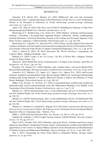 1. Ахмадеев К.Н., Бреслер М.Г., Манойло А.В. (2021) Эффективность fake news как инструмента информационной войны в восприятии поколения Z // Вестник Московского государственного областного университета. № 3. С. 8-32. EDN: IFWWCQ