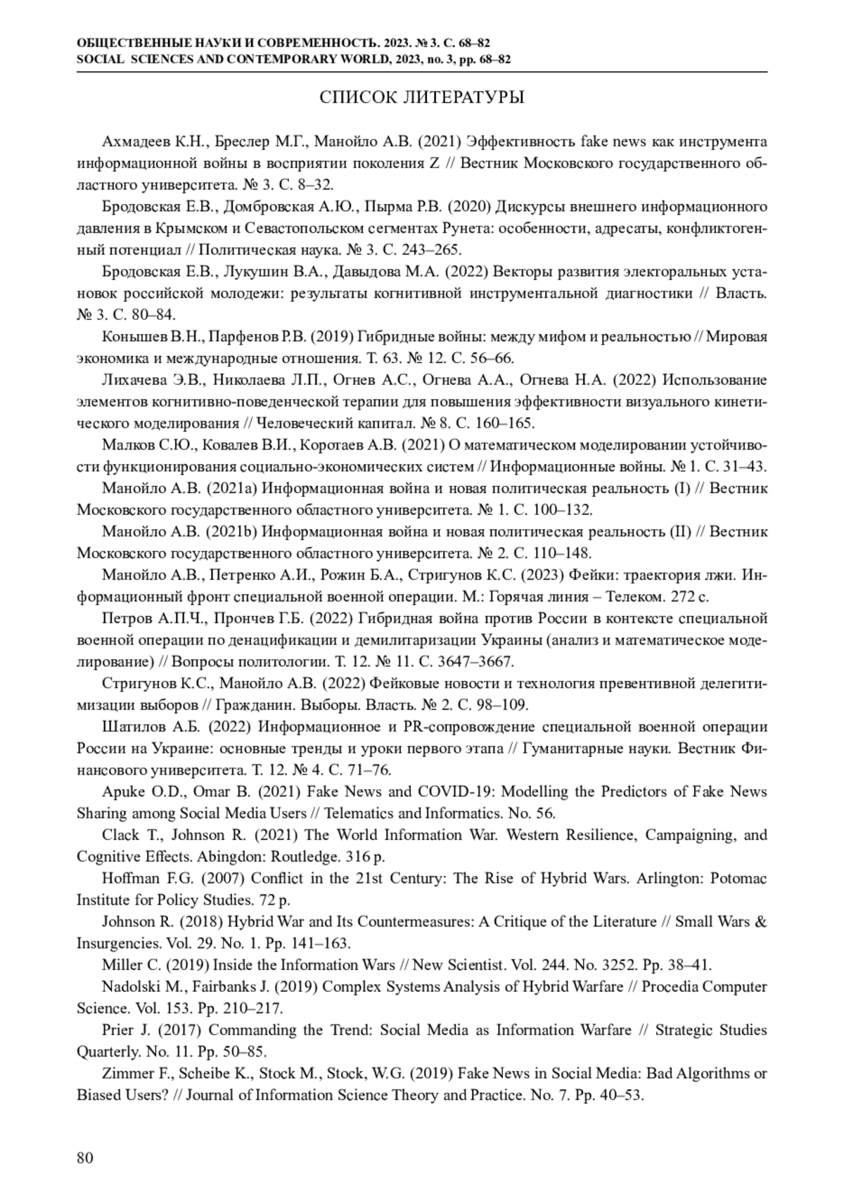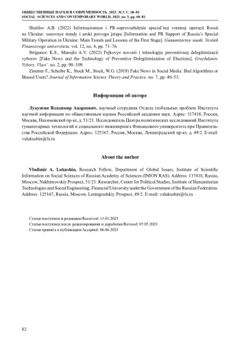 9. Манойло А.В., Петренко А.И., Рожин Б.А., Стригунов К.С. (2023) Фейки: траектория лжи. Информационный фронт специальной военной операции. М.: Горячая линия - Телеком. 272 с.