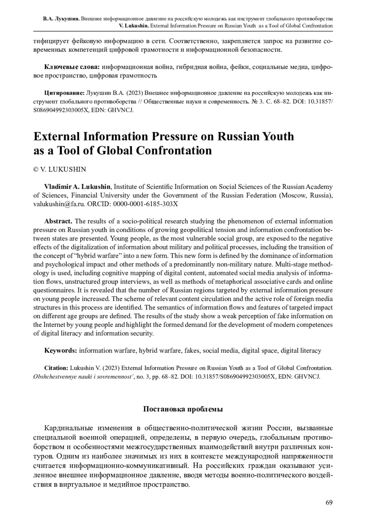 Представлены результаты комплексного социально-политического исследования, которое посвящено феномену внешнего информационного давления на российскую молодежь в условиях усиления геополитической напряженности и информационного противоборства между государствами. Молодежь как наиболее уязвимая социальная группа подвержена негативным эффектам цифровизации информации о военно-политических процессах, включая переход «гибридной войны» в новую форму. В ней доминирует информационно-психологическое воздействие и иные методы преимущественно невоенного характера. Многоступенчатая методика исследования включает в себя когнитивное картирование цифровых документов, автоматизированный социально-медийный анализ информационных потоков, неструктурированное групповое интервью, а также методы метафорических ассоциативных карт и онлайн-анкетирования. Выявлено, что растет количество регионовмишеней внешнего информационного давления на молодежь. Определена схема циркуляции соответствующего контента, выявлена активная роль иностранных медиаструктур в данном процессе. Выделено семантическое ядро информационного потока и особенности адресного воздействия на различные возрастные группы. Результаты исследования демонстрируют, что молодежь плохо идентифицирует фейковую информацию в сети. Соответственно, закрепляется запрос на развитие современных компетенций цифровой грамотности и информационной безопасности