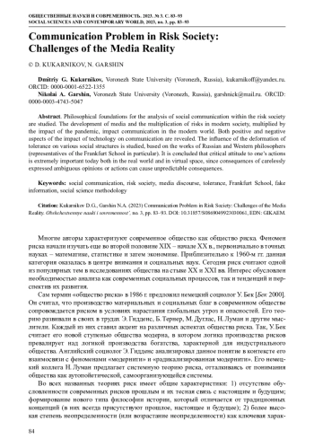 Рассмотрены философские основания анализа социальной коммуникации в обществе риска. Изучены как позитивные, так и негативные стороны воздействия развития медиа и нарастания мультипликативных рисков в обществе, катализатором которых стала пандемия, на коммуникацию в современном мире. С опорой на работы российских и западных философов (в частности, представителей Франкфуртской школы) рассмотрено влияние деформации толерантности на различные социальные структуры. Сделан вывод, что важно критически оценивать действия и в реальном мире, и в виртуальном пространстве. Крайне неосторожно высказанное неоднозначное мнение или выполненное действие могут вызвать непредвиденные последствия