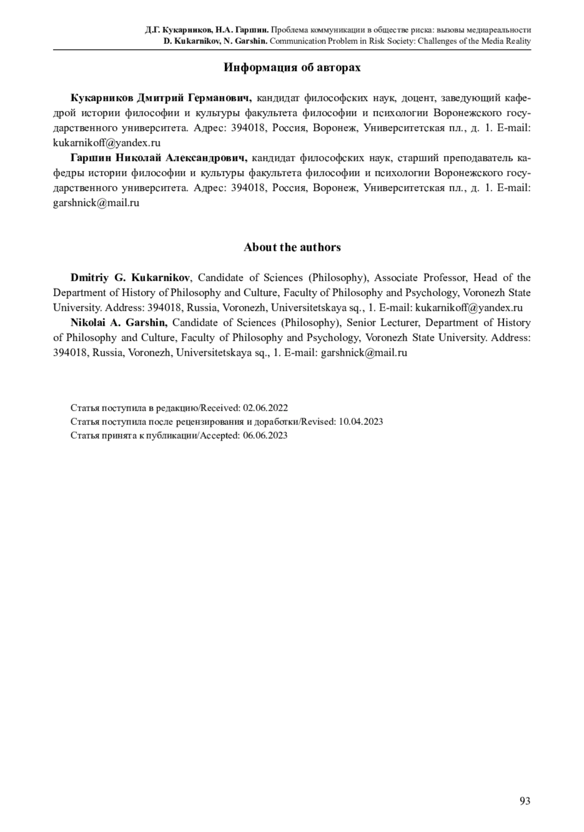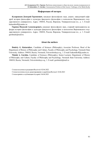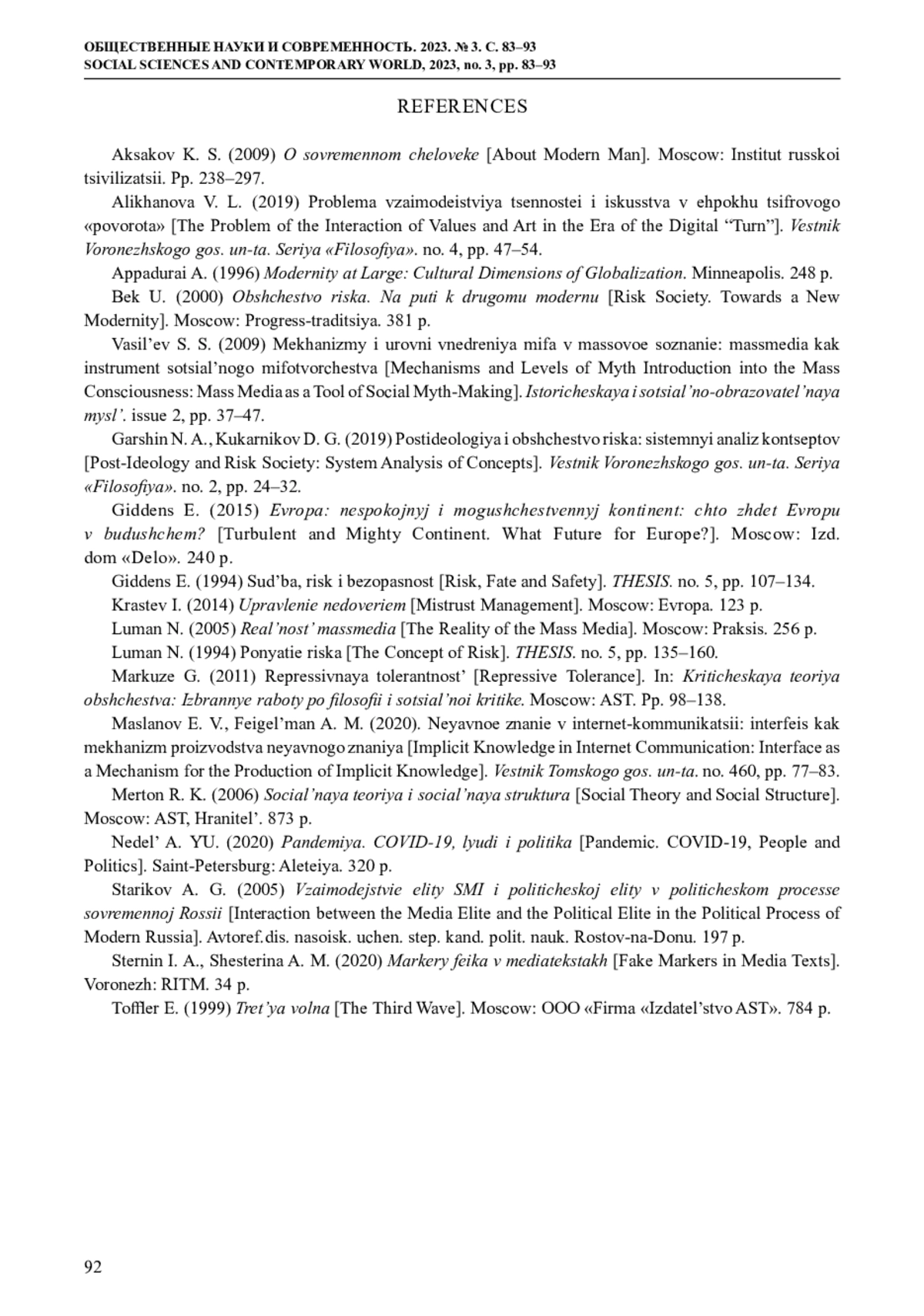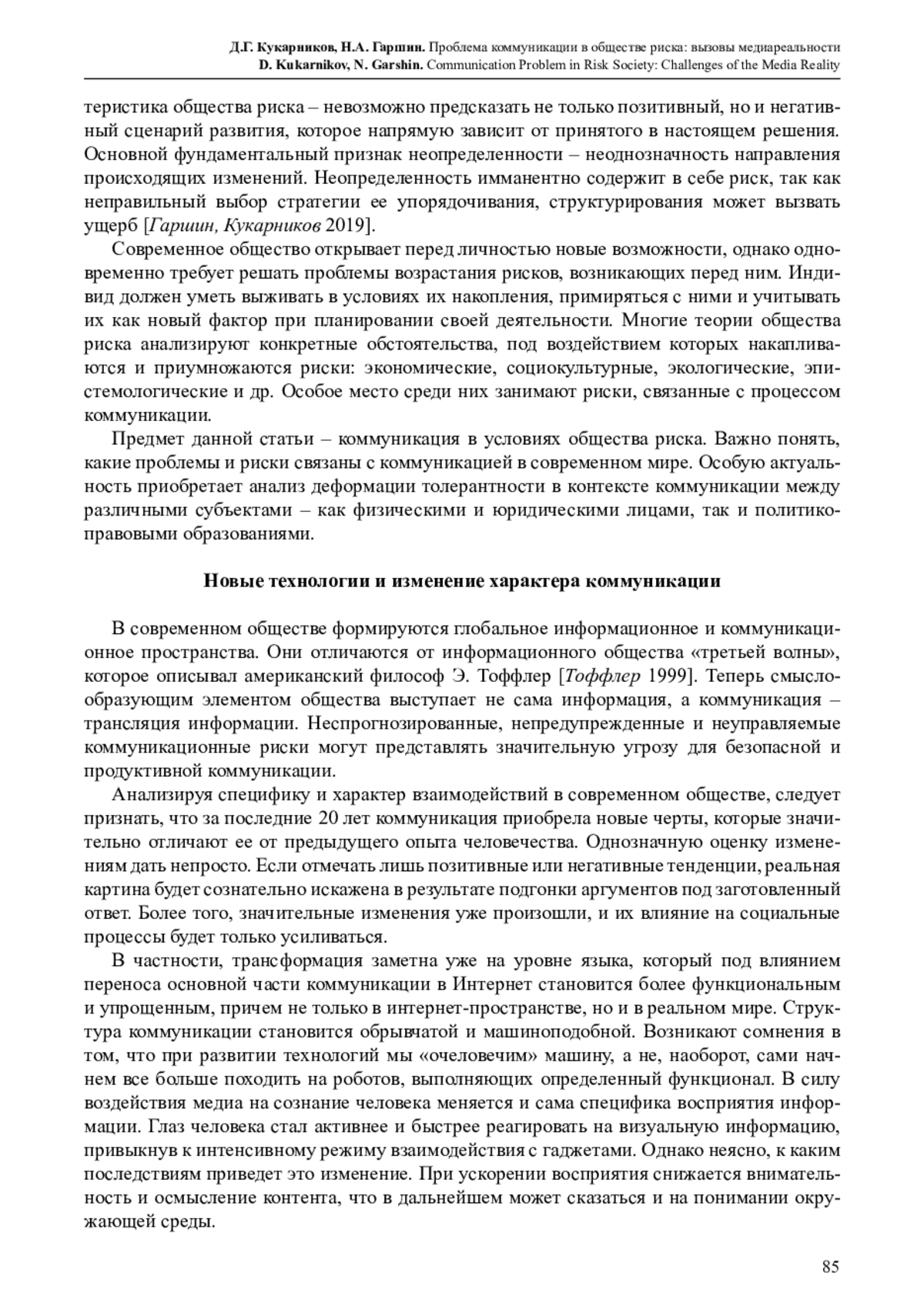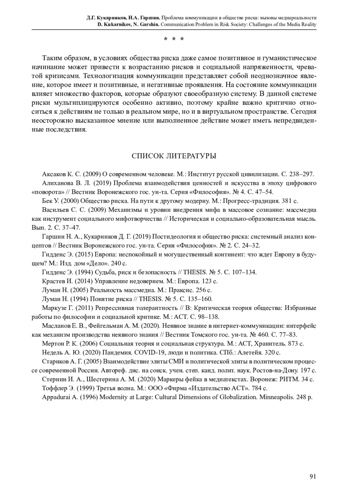 5. Гаршин Н. А., Кукарников Д. Г. (2019) Постидеология и общество риска: системный анализ концептов // Вестник Воронежского гос. ун-та. Серия “Философия”. № 2. С. 24-32. EDN: FLVZYT