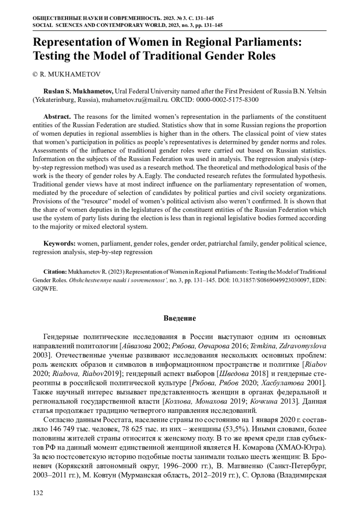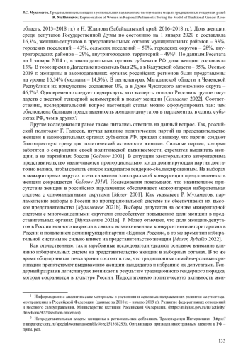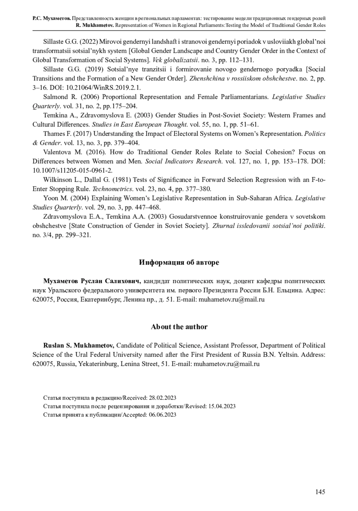 7. Мухаметов Р.С. (2021b) Высокое представительство женщин в парламенте и пропорциональная избирательная система: работает ли эта взаимосвязь в России? // Сравнительная политика. № 2. С. 82-93. DOI: 10.24411/2221-3279-2021-10021 EDN: FJHHQB