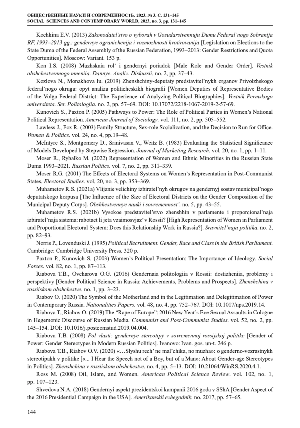 6. Мухаметов Р.С. (2021а) Влияние величины избирательных округов на гендерный состав муниципального депутатского корпуса // Общественные науки и современность. № 5. С. 43-55. DOI: 10.31857/S086904990017284-4 EDN: CGWXET